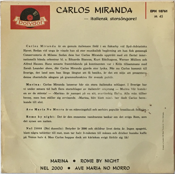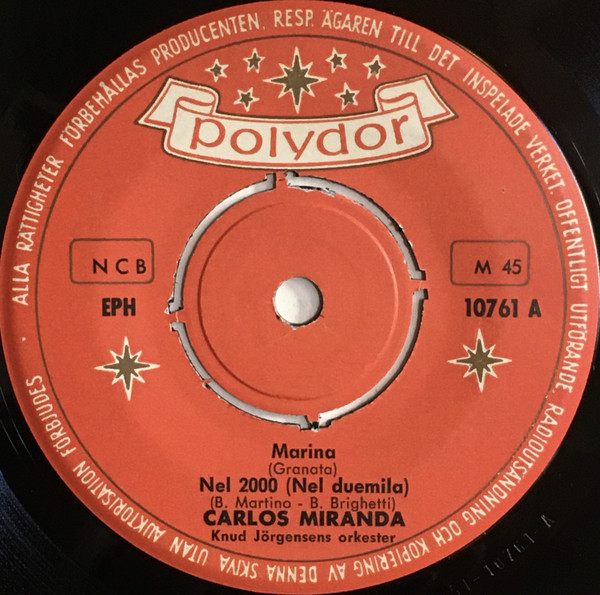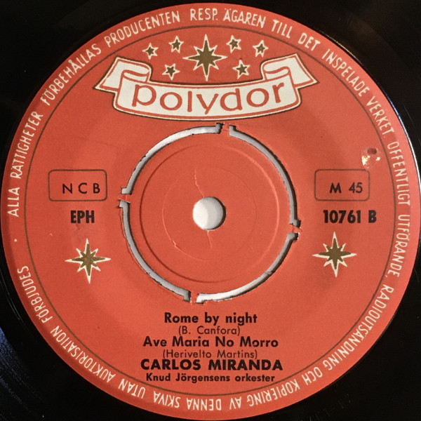 Die Titel der POLYDOR-EP in #1 wurden in Schweden eingespielt. Das Begleitorchester stand aber unter der Leitung des Dänen Knud Jörgensen. Da aber Dänemark sehr häufig zu Skandinavien gezählt wird, handelt es sich quasi um eine innere Angelegenheit. Die schwedische EP in #15 halte ich daher für die Erst-Veröffentlichung. Carlos Miranda hat sich in Schweden nicht nur von einem Dänen begleiten lassen, sondern auch von einem US-Amerikaner. Benny Bailey stammte nämlich aus Ohio, USA, und blieb im Rahmen einer Europa-Tournee einige Zeit in Schweden hängen und so entstand die Single mit Carlos Miranda (#7).