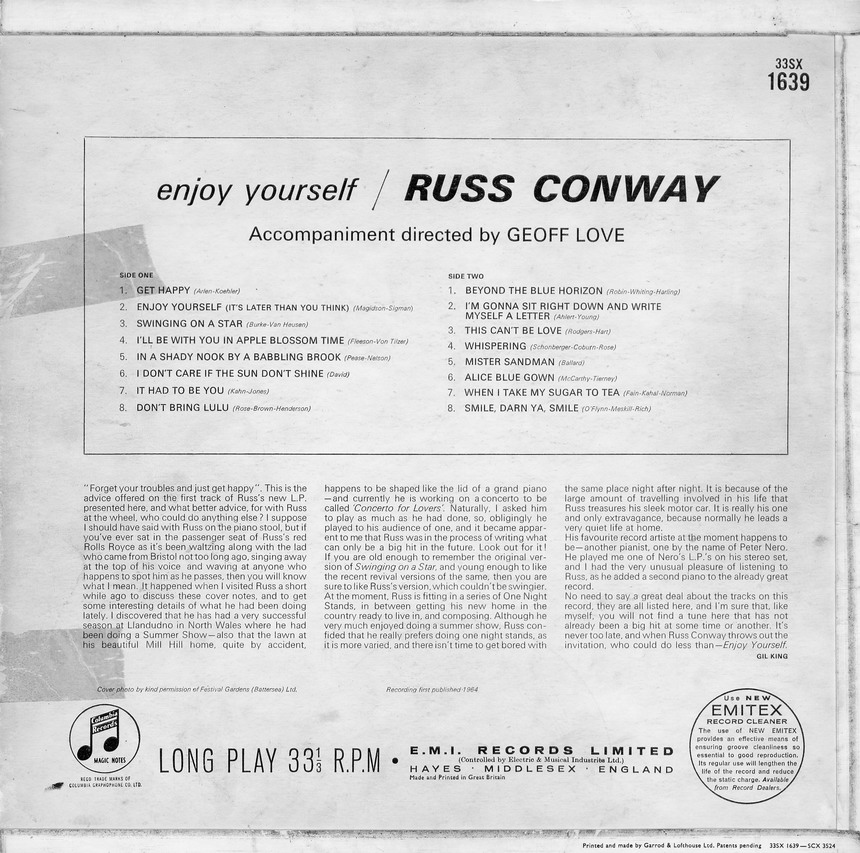 11 60....45-DB 4535....RUSS CONWAY Accompaniment Directed by Geoff Love..EVEN MORE PARTY POPS (a) Ain't She Sweet (b) I can't give you anything but love (c) Yes, we have no bananas (7XCA.25298)/(a) I May be Wrong (b) Happy Days & Lonely Nights (c) Glad Rag Doll (7XCA.25299)