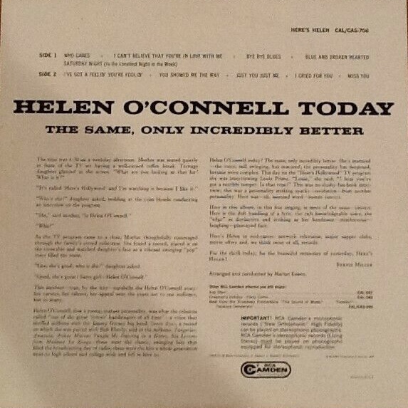 Helen O'Connell (* 23. Mai 1920, + 09. September 1993) war eine US-amerikanische Sängerin, Schauspielerin und Gastgeberin, die als "die Quintessenz der Big-Band-Sängerin der 1940 er Jahre" beschrieben wurde.