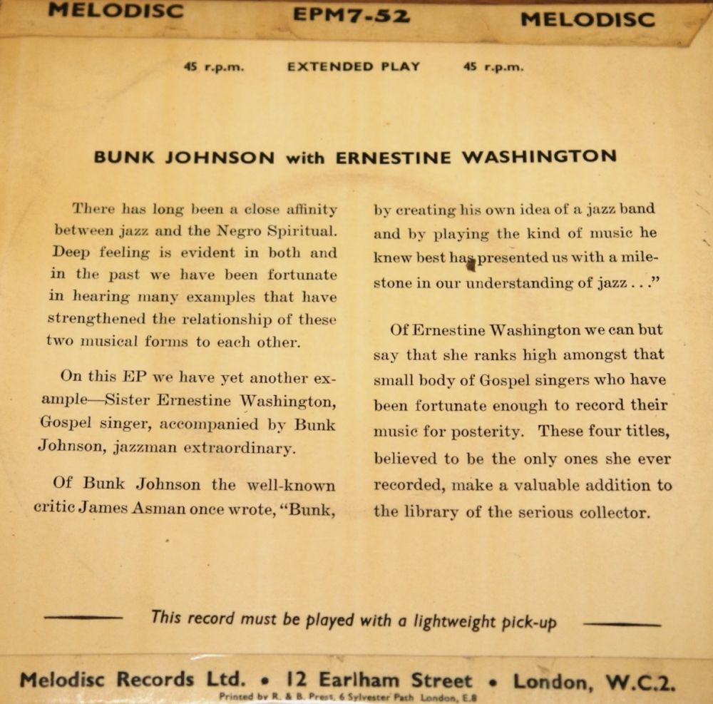 Der Name Schwester Ernestine Washington ist weißen Fans schwarzer Musik vor allem deshalb ein Begriff, weil sie 1946 mit der George Lewis-Bunk Johnson Jazz-Band vier Lieder aufnahm, die auf dem folklorischen Disc-Label erschienen. Sie sind jedoch eine Ausnahme in ihrer Karriere oder ihren anderen Aufnahmen.