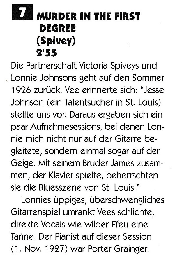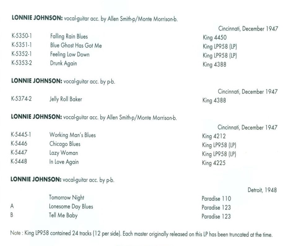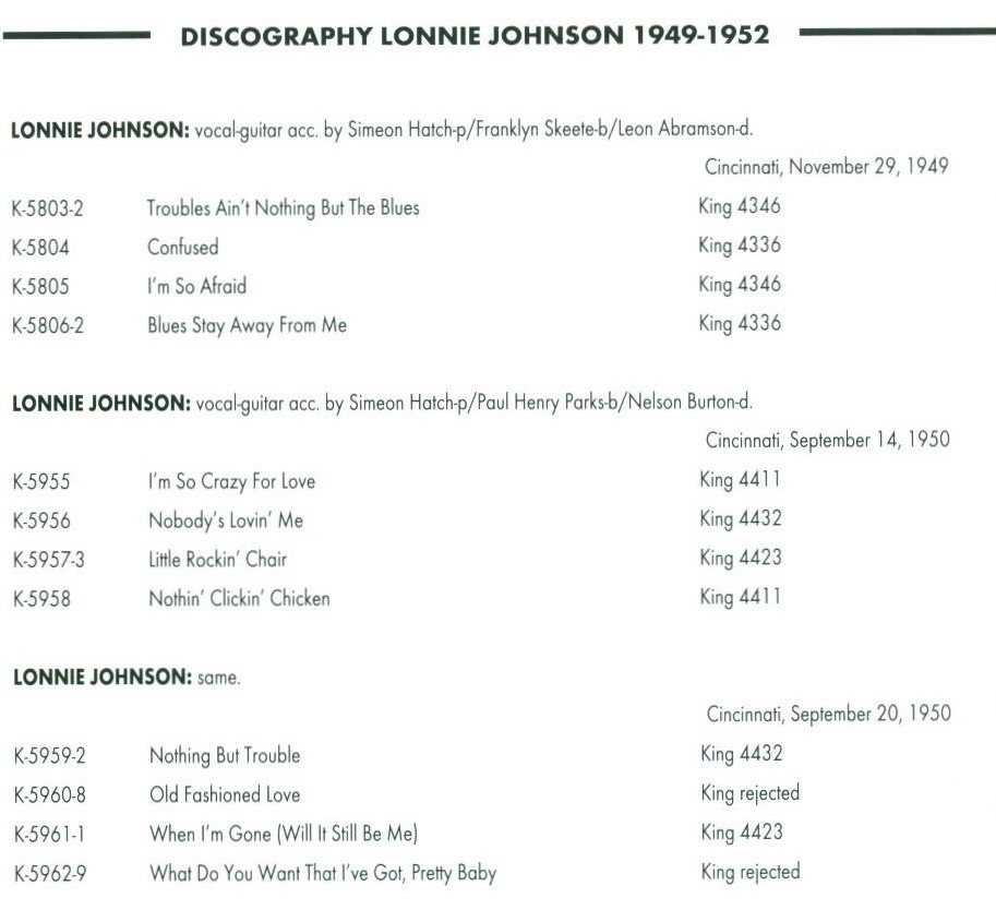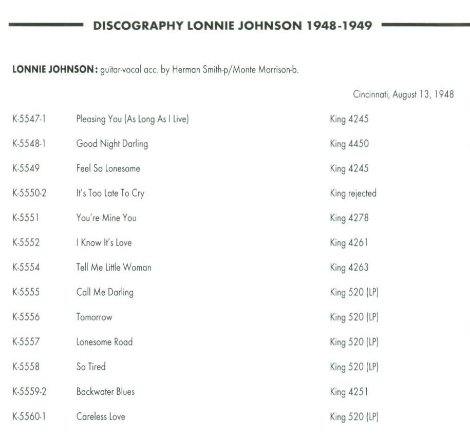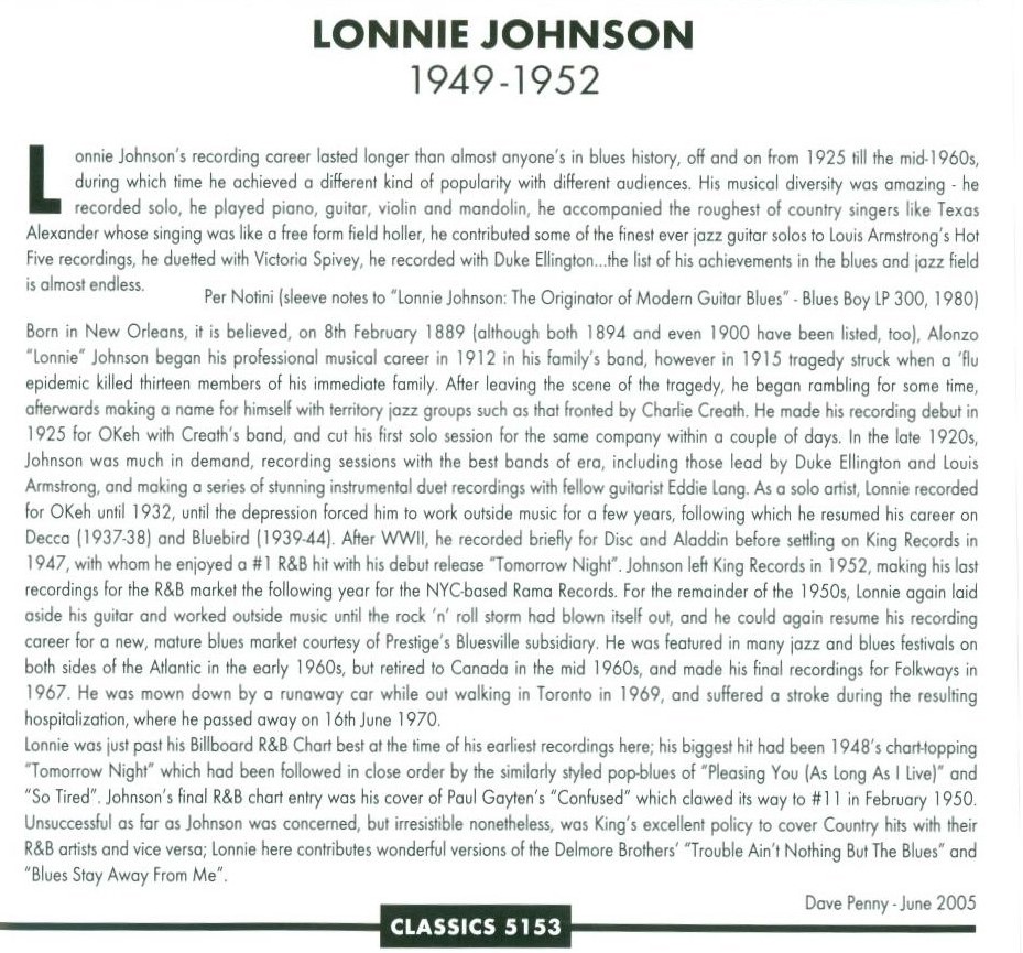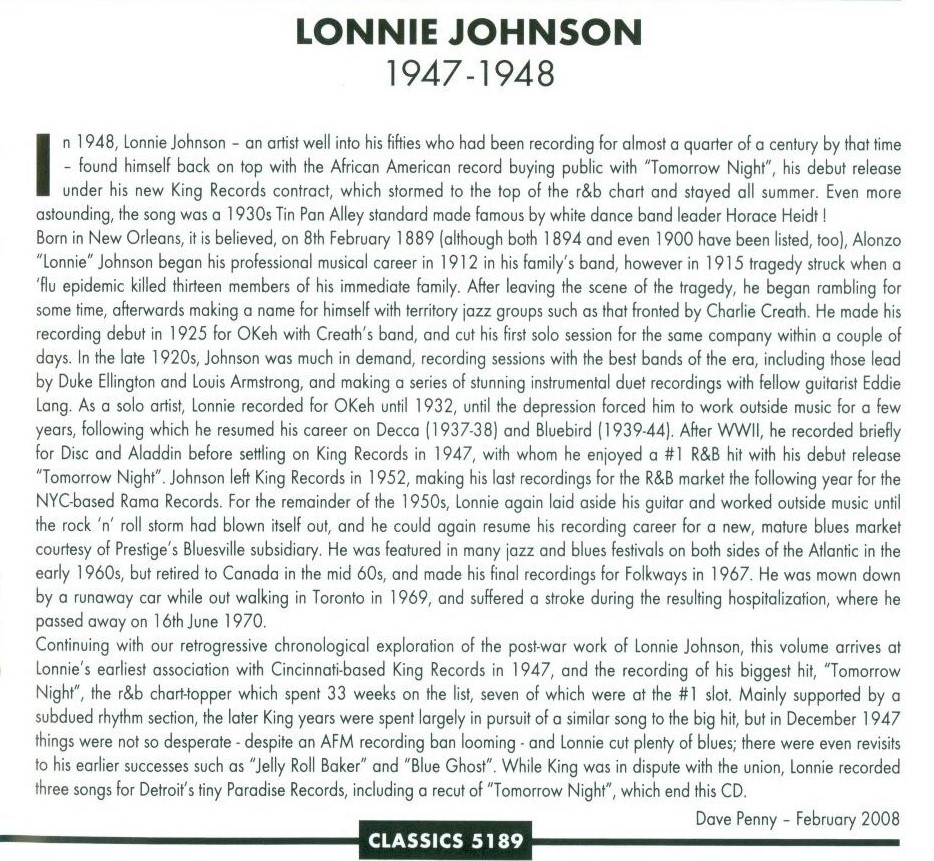 Der Blues-Sänger und Gitarrist Lonnie Johnson wurde am 8. Februar 1899 in New Orleans, Louisiana, als Alonzo Johnson geboren und verstarb am 16. Juni 1970 in Toronto, Ontario, Kanada, wo er seit 1965 lebte, an den Spätfolgen eines Autounfalles, den er im März 1969 erlitten hat.