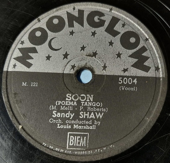 Eine Single-Disco geht sich aber aus: MOONGLOW (B) 03 57....5004x45....SANDY SHAW Orch. conducted by Louis Marshall..Soon (Poema Tango) (M - 121)/Oh, Cherie (M - 122)