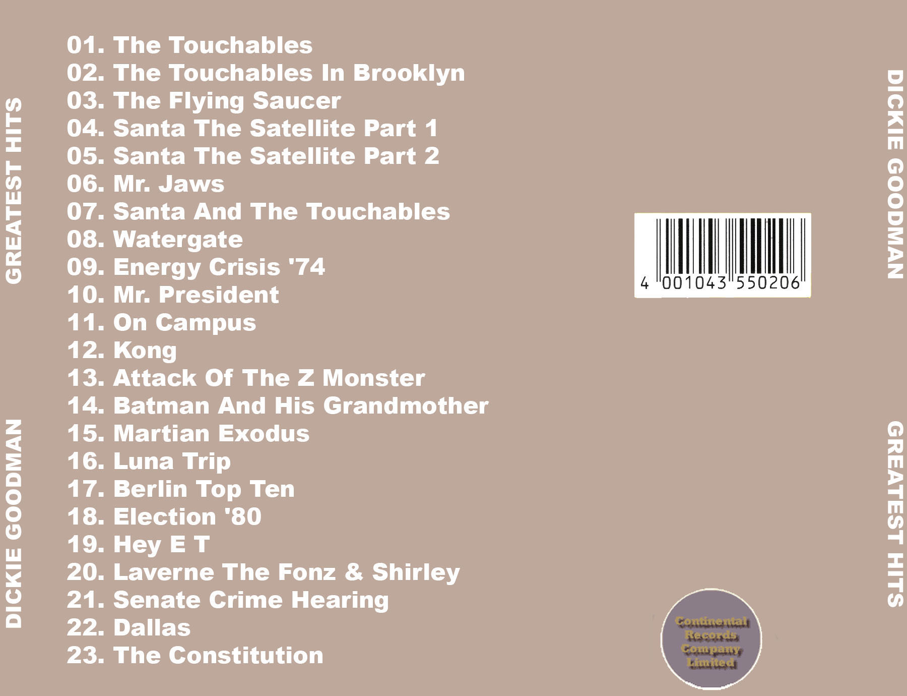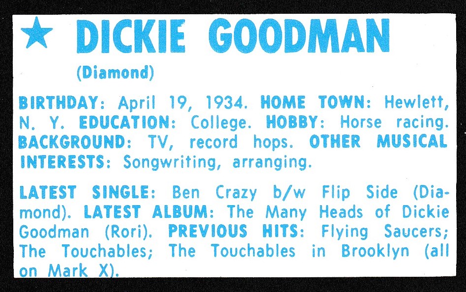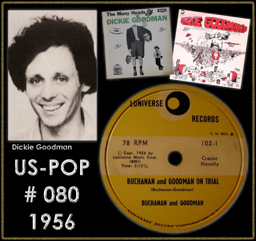 Dickie Goodman (links klicken), geboren 19. April 1934 in Brooklyn, New York, als Richard Dorian Goodman und verstorben am 6. November 1989 in North Carolina, erst 55-jährig, an einer selbst zugefügten Schußwunde, taten sich im Juni 1956 zusammen und produzierten eine Reihe spezieller Noveltys, so genannte Break-in-Records.