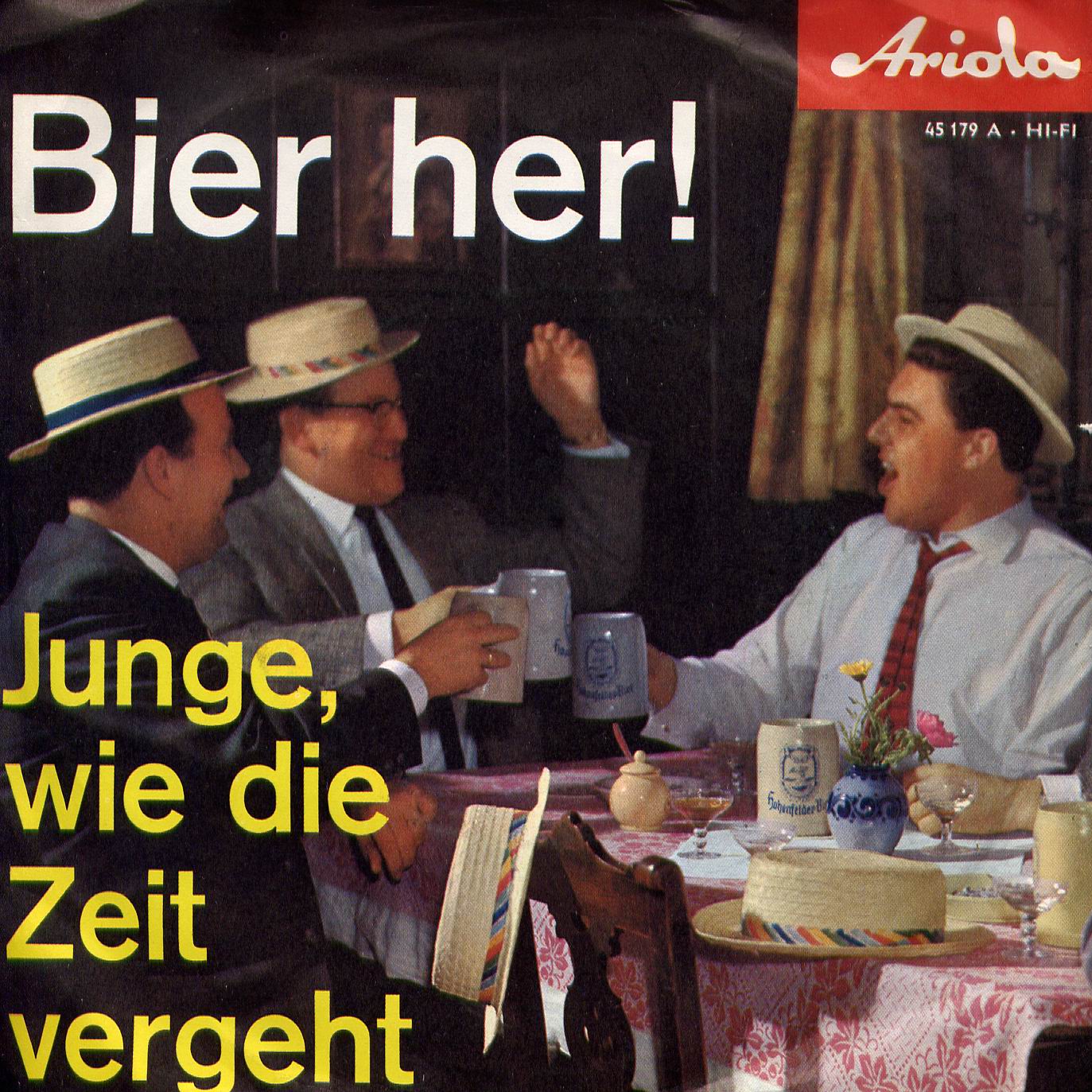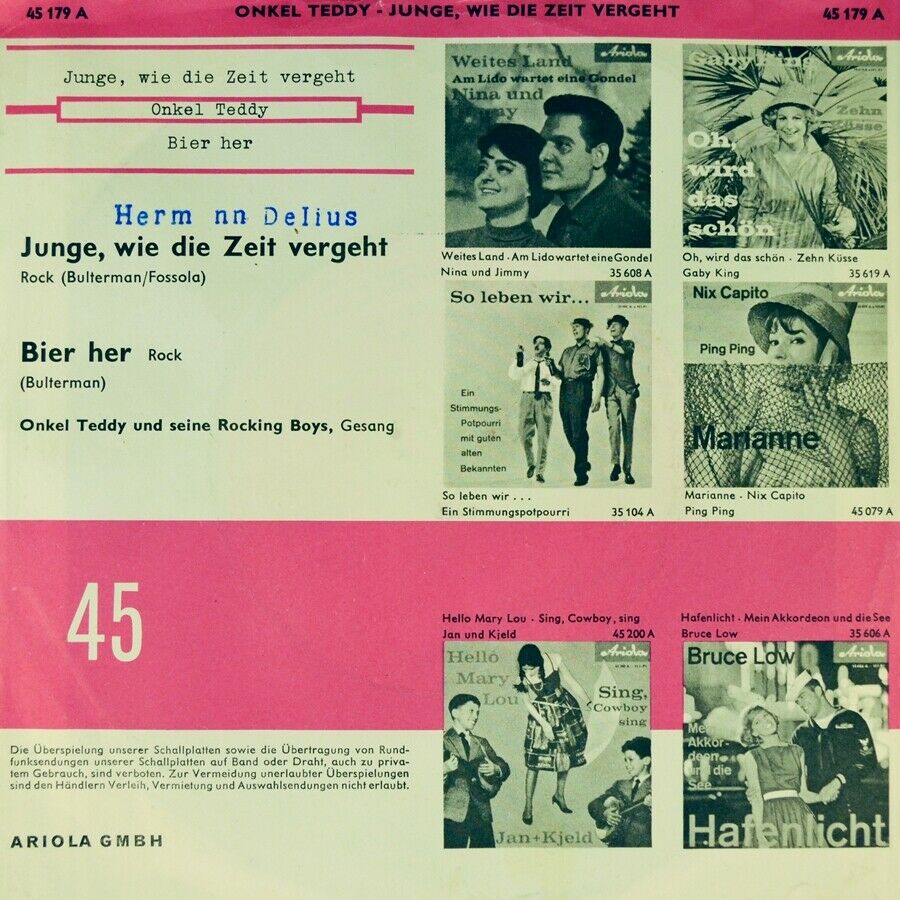Juli 1961 Ariola 45179 als ONKEL TEDDY & eine Rock’n’Rolls (Twisttitel "Bier Her!"/"Junge, Wie Die Zeit Vergeht") (Die MOONLIGHT & KURT HELLWIG, BERND GOLONSKI, WOLFGANG SCHULTE, SIGURD HILKENBACH, WOLF HACKE u. GÜNTER KALLMANN, Orchester u. Arrangement: WILLY HOFFMANN, ERHARD WENIG-ts)