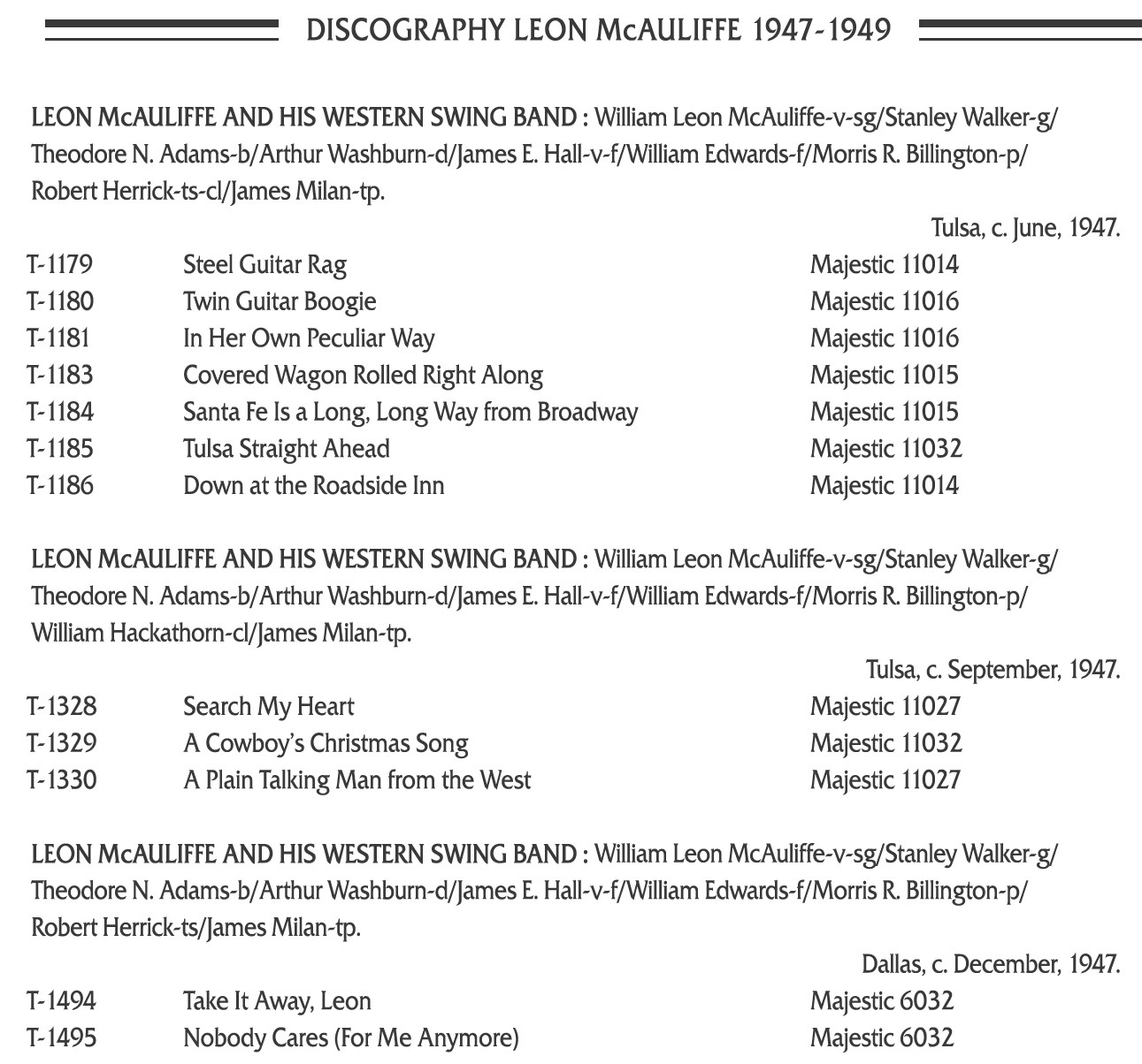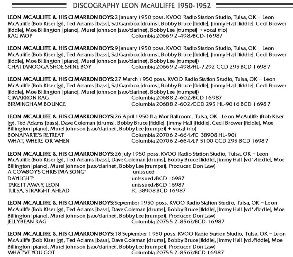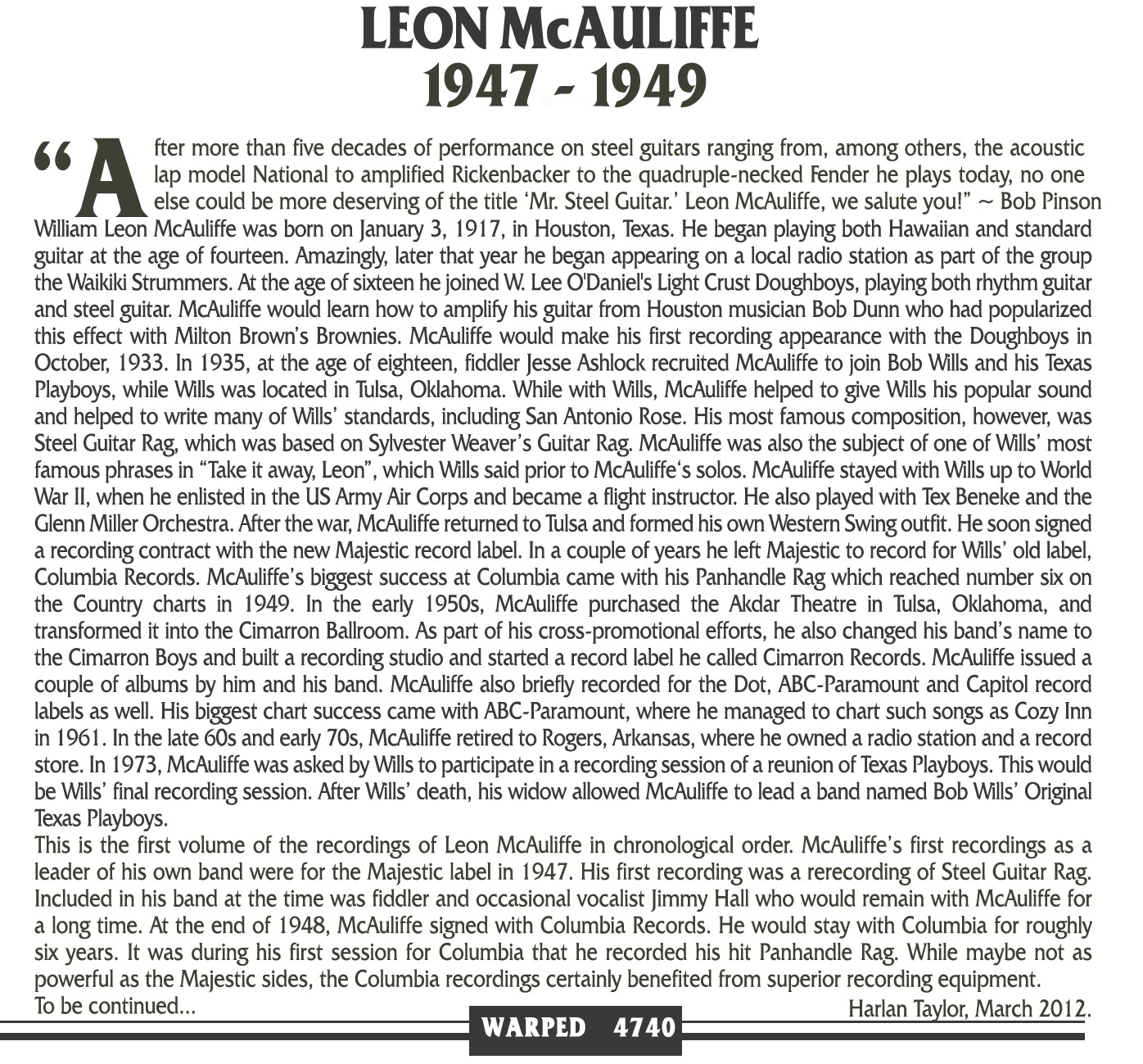 Kurz-Bio: Der Western Swing Musiker und Sänger Leon McAuliff wurde am 3. Jänner 1917 in Houston, Texas, als William Leon McAuliffe geboren und verstarb am 20. August 1988 nach längerer schwerer Krankheit, erst 71-jährig, in einem Spital in Tulsa, Oklahoma.