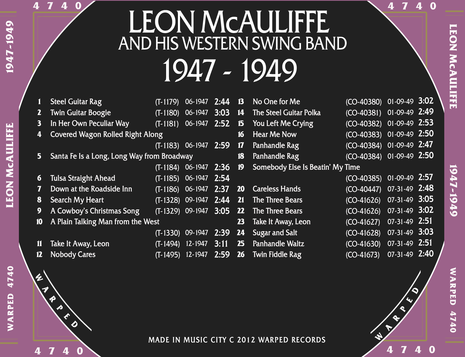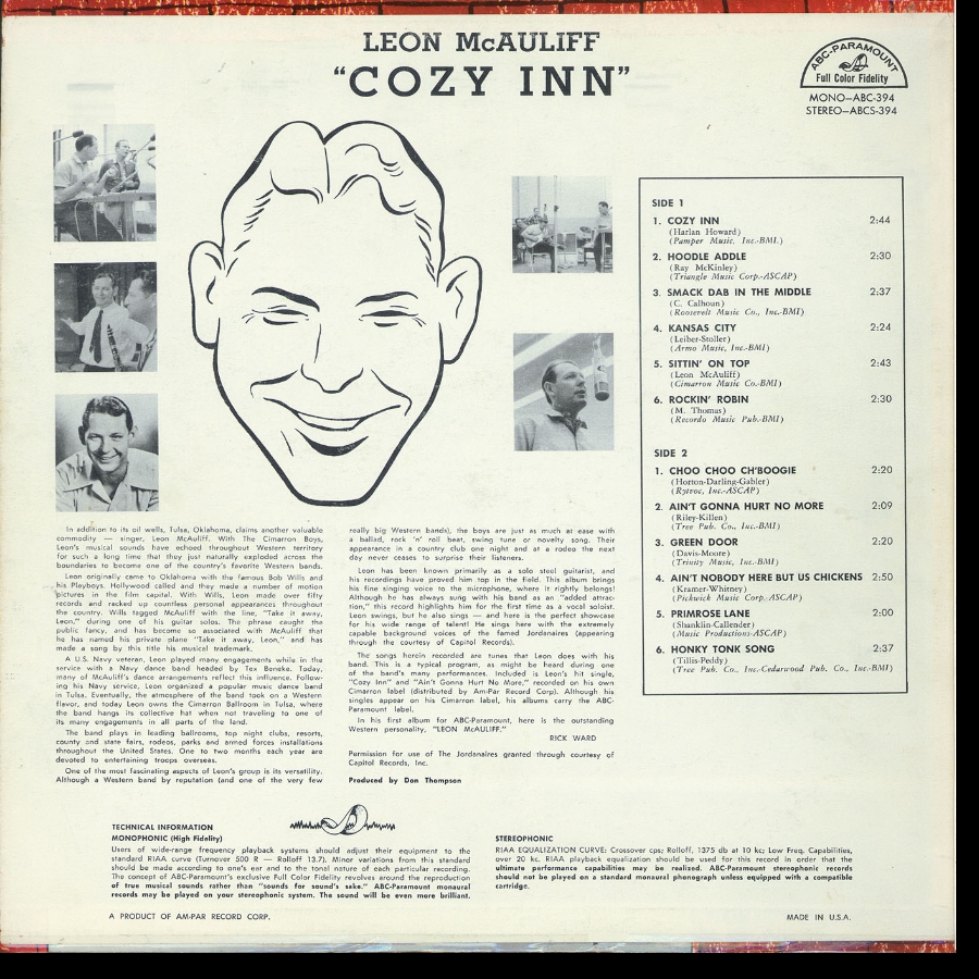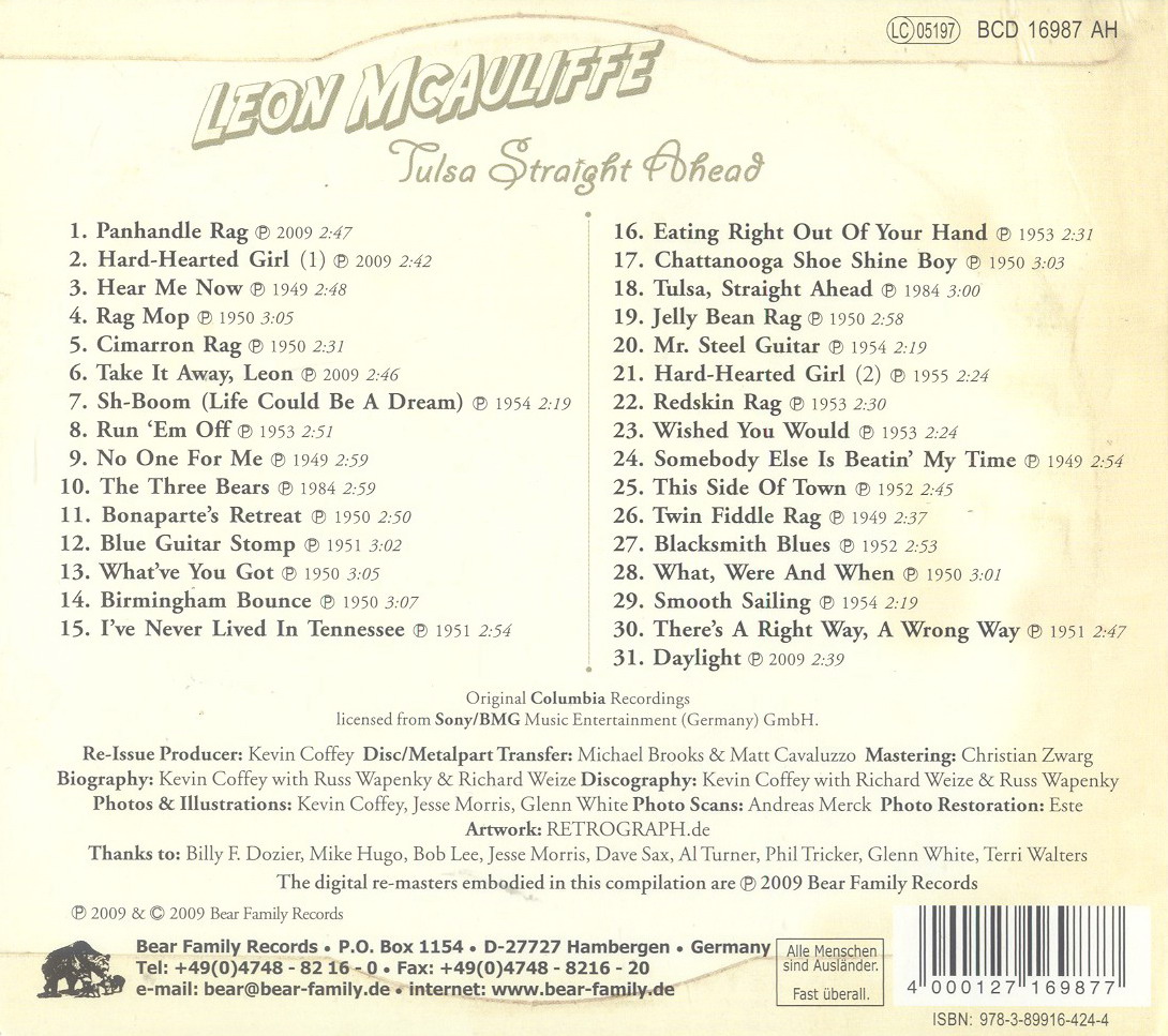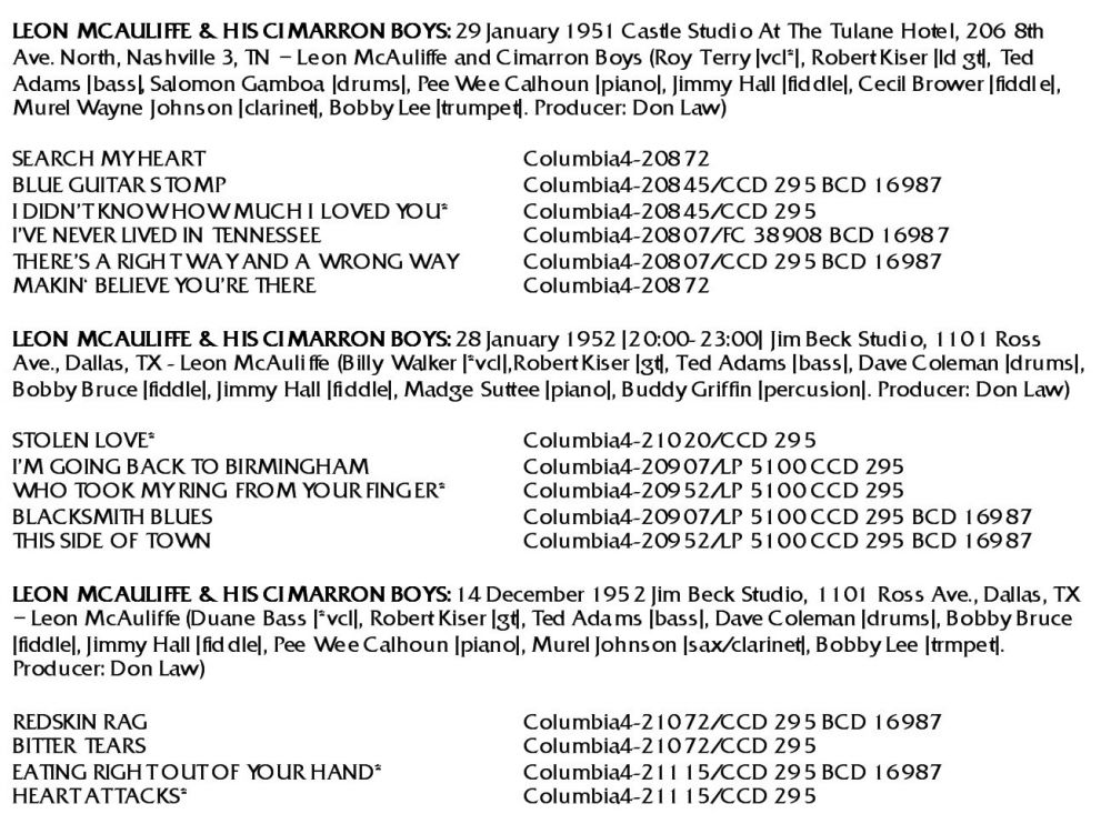 Kurz-Bio: Der Western Swing Musiker und Sänger Leon McAuliff wurde am 3. Jänner 1917 in Houston, Texas, als William Leon McAuliffe geboren und verstarb am 20. August 1988 nach längerer schwerer Krankheit, erst 71-jährig, in einem Spital in Tulsa, Oklahoma.