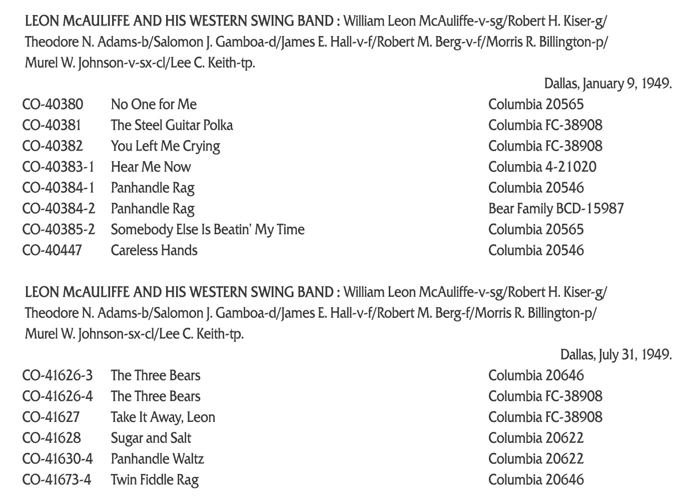 Die Vinyl-Singles von Leon McAuliff: COLUMBIA - 33 1/3 - Vinyl-Singles 02 49....2 - 137 (20546)….LEON McAULIFFE and his Western Swing Band Vocal by Jimmy Hall..Careless Hands/LEON McAULIFFE and his Western Swing Band..Panhandle Rag