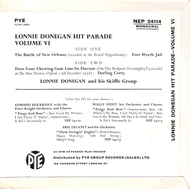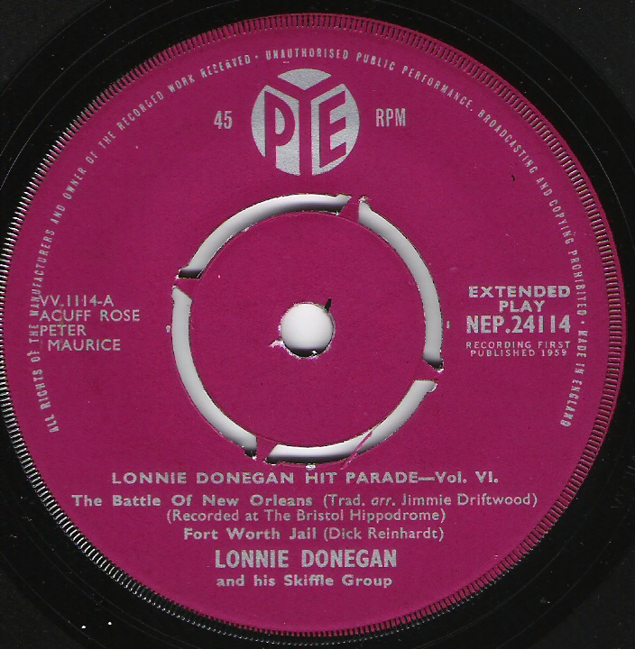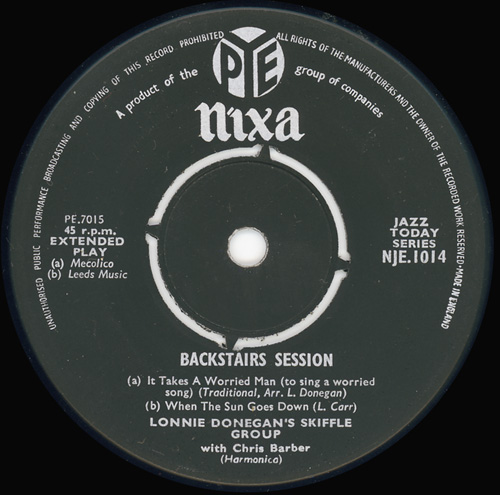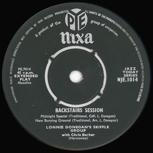 Zunächst eine EP mit Midnight special / When the sun goes down / New Burying ground / Worried man blues (Mixa NJE 1014). Die vier Songs wurden am 19.5.1955 aufgenommen und zur Besetzung gehörten neben Lonnie Donegan (git, voc) auch Chris Barber (harmonica), Dick Bishop (git, voc), Jim Bray (bass), Bob Watson (voice) und Pete Korrison (mandolin).