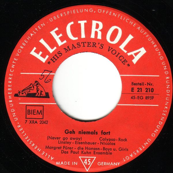 - Offenbar wurden beide Songs am selben Tag aufgenommen – Dieter nennt den 2. Juni 1958. Dann wäre es naheliegend, dass Instrumente und Männerchor von den selben Musikern beigesteuert wurden…