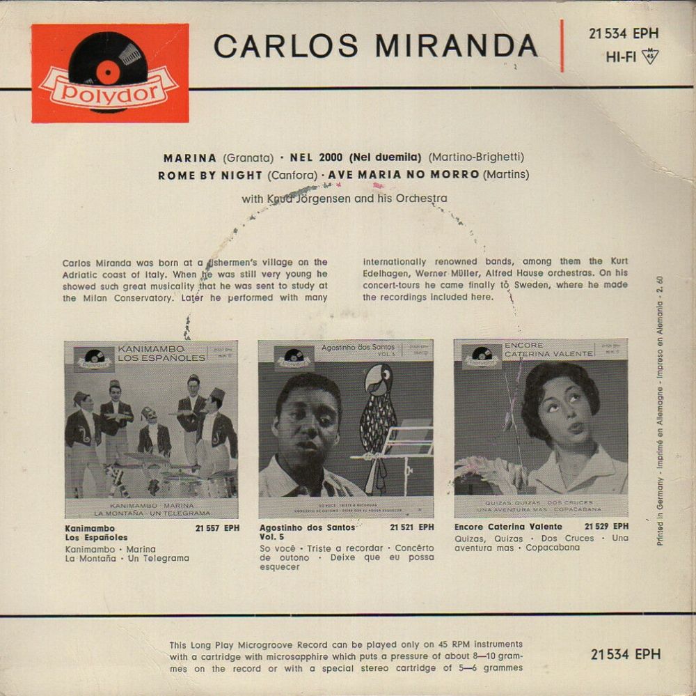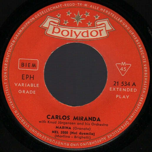 Carlos Miranda auf Polydor-EP (Februar 1960) Anhänge an diesem Beitrag Dateiname: Marina4a.jpg Dateigröße: 210.27 KB Titel: Heruntergeladen: 261 Dateiname: Marina4b.jpg Dateigröße: 191.36 KB Titel: Heruntergeladen: 258 Dateiname: Marina4d.jpg Dateigröße: 163.62 KB Titel: Heruntergeladen: 250