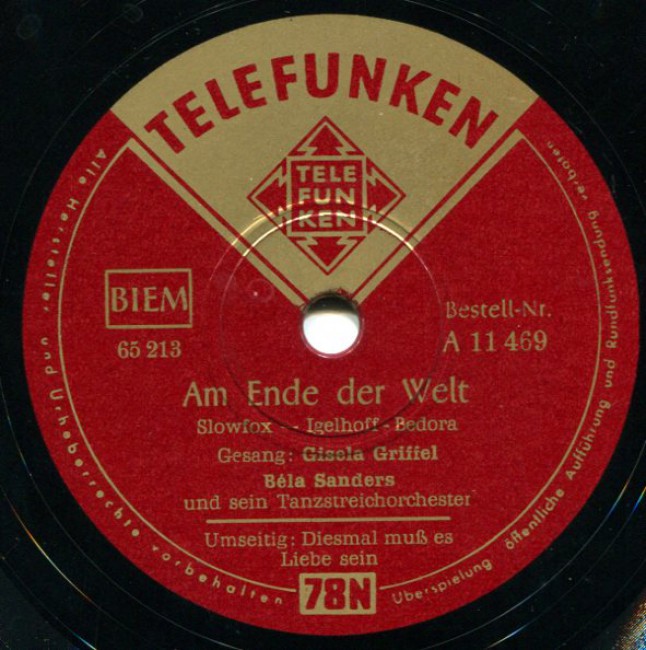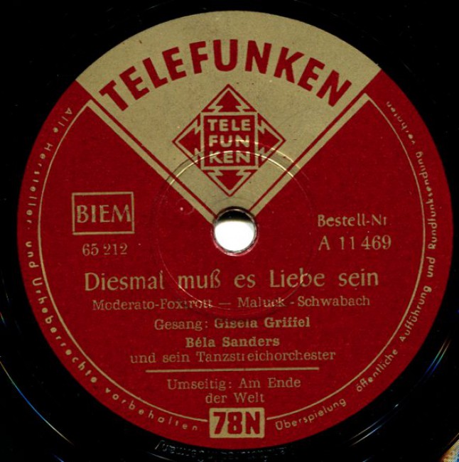 03 54....U 45 469....Gesang: Gisela Griffel Béla Sanders und sein Tanzstreichorchester..Diesmal muß es Liebe sein/Am Ende der Welt