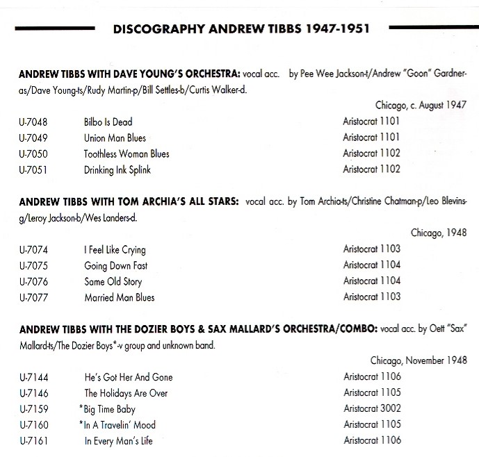 Andrew Tibbs war ein Tenor. Seine weiche Stimme und seine warmherzige Art täuschten darüber hinweg, dass er in Wirklichkeit sehr abenteuerlustig und vergnügungssüchtig war. ,,Ich hab nie was anbrennen lassen“, sagte er des Öfteren. „Ich wollte einfach meinen Spaß haben.“ Goldberg interessierte sich so sehr für Tibbs, dass er ihn ins Macomba brachte und Leonard vorstellte. Die beiden verstanden sich gut, und Tibbs sang schließlich zwischen seinen Sets im Jimmy's in der Lounge von Leonard Chess. Darüber hinaus erwies er sich als Katalysator für Leonards Vordringen ins Plattengeschäft.