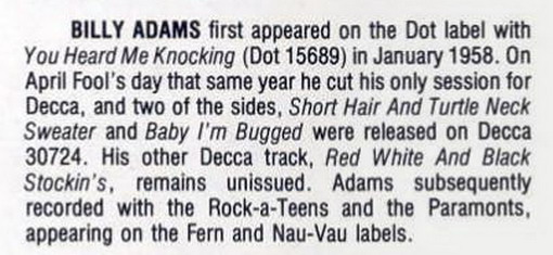 hier die Lösung zu dem Decca-Billy Adams, auf dem Sampler "Old Time Rock'n'Roll" wo beide Titel drauf sind Anhänge an diesem Beitrag Dateiname: Old Time Rock'n'Roll (2)x.jpg Dateigröße: 47.08 KB Titel: Old Time Rock'n'Roll (2)x.jpg Heruntergeladen: 148 Dateiname: -- Old Time Rock'n'R … dern.jpg Dateigröße: 268.19 KB Titel: -- Old Time Rock'n'Roll (3)_Bildgröße ändern.jpg Heruntergeladen: 182