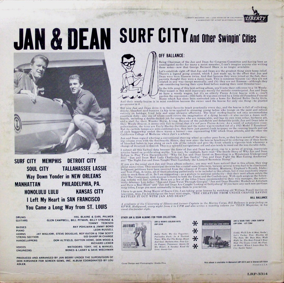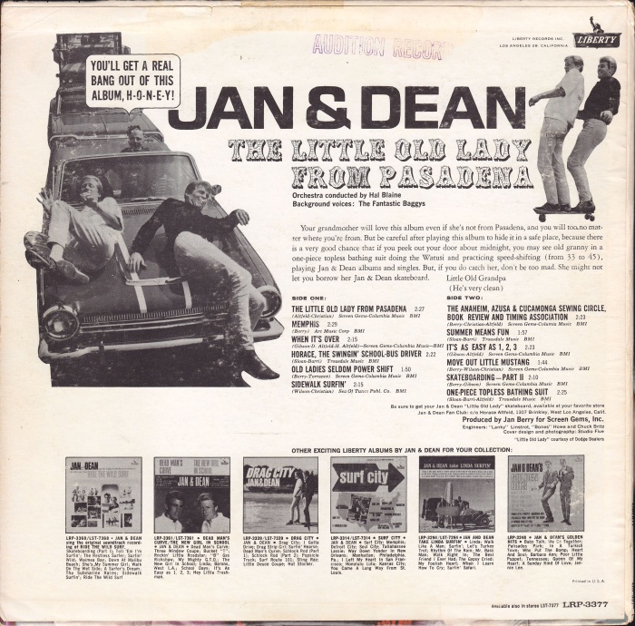 Anyone who listens to the session outtakes (available at one time on bootleg albums) of “Little Old Lady” and compared them to the 45 can hear that the falsetto voice and parts are entirely different. Dean was there for the sessions but mixed down on the final track, along with some trumpet parts. It is also clear that Dean is on a great many – the vast majority of – singles and album tracks. To Jan & Dean fans, singles like “Surf City” have always been a relatively