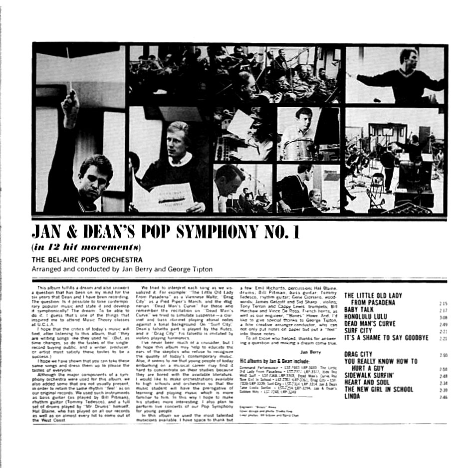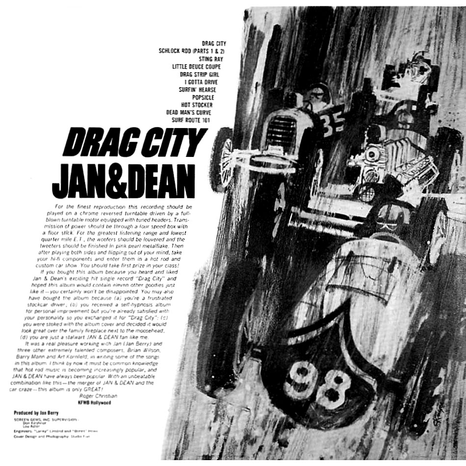 „ There was no music more exciting than Jan & Dean records in 1964. The sound effects, the fast tempo, and the tight harmonies all made the terrific music. One thing that made Jan & Dean records so energetic was that Jan used two trap sets for his sessions. Originally, he had tried having ace drummer Hal Blaine overdub his drums, playing the same licks twice, synchronized on tape. Not satisfied with the results, he had Earl Palmer come to the sessions as well as Hal. Together they rehearsed until they were playing their drums in perfect synch. This pioneering effort on the part of Jan is just one of the things that set Jan & Dean records apart from other similar records of the era.