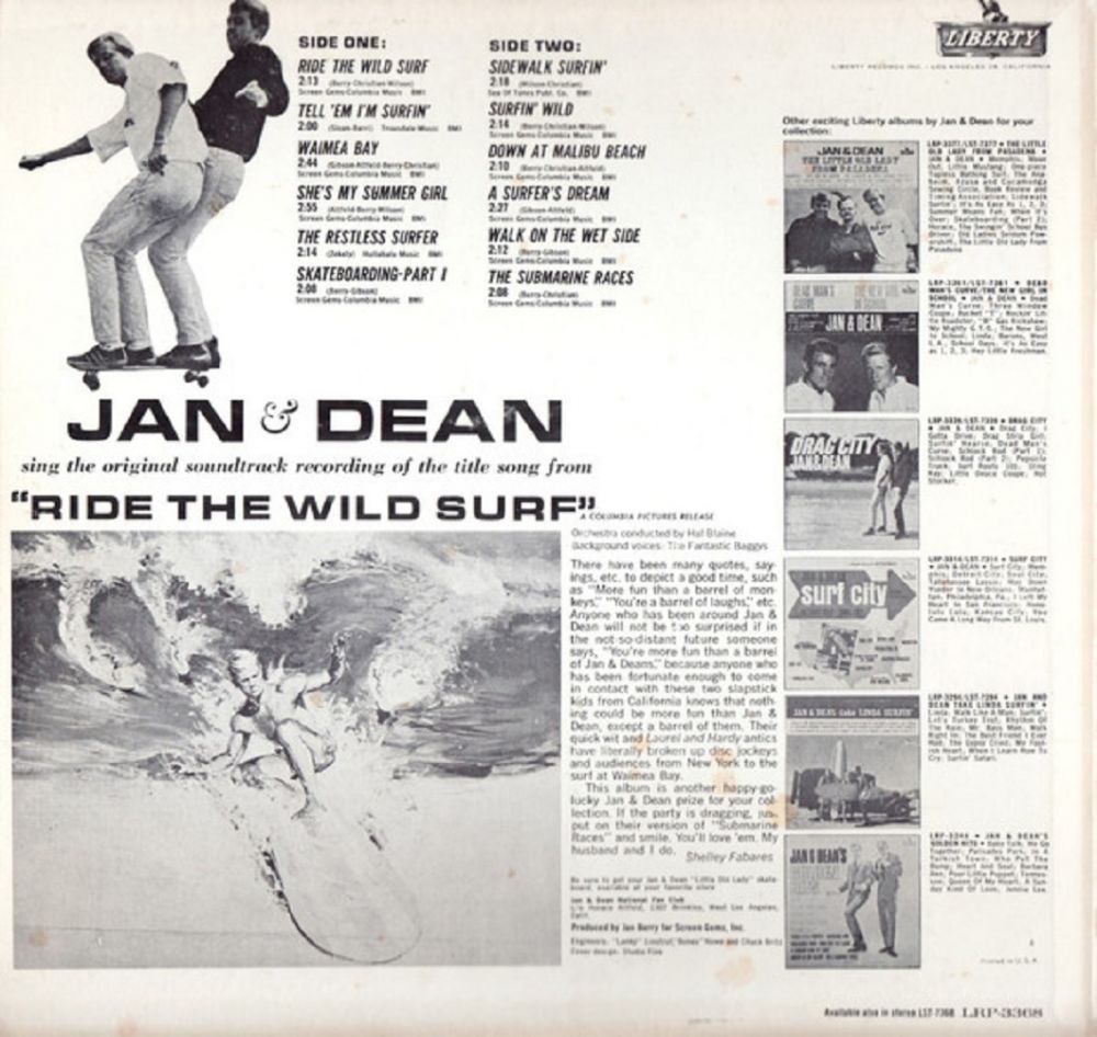 What no one knew at the time was that Jan & Dean were not a duo, but actually a “supergroup,” made up of hit artists, session singers, songwriters and session musicians. Jan, as leader of the group, was on all but a handful of LP cuts. Dean, as second banana, was on somewhat fewer cuts, and in fact his voice was missing from many of their hits, thanks to Jan´s studio mixing techniques. Some of the Liberty hits Dean´s voice is not on include “Surf City”, “Little Old Lady (From Pasadena),” “Sidewalk Surfin´,“”You Really Know How To Hurt A Guy,” and “I Found A Girl.”