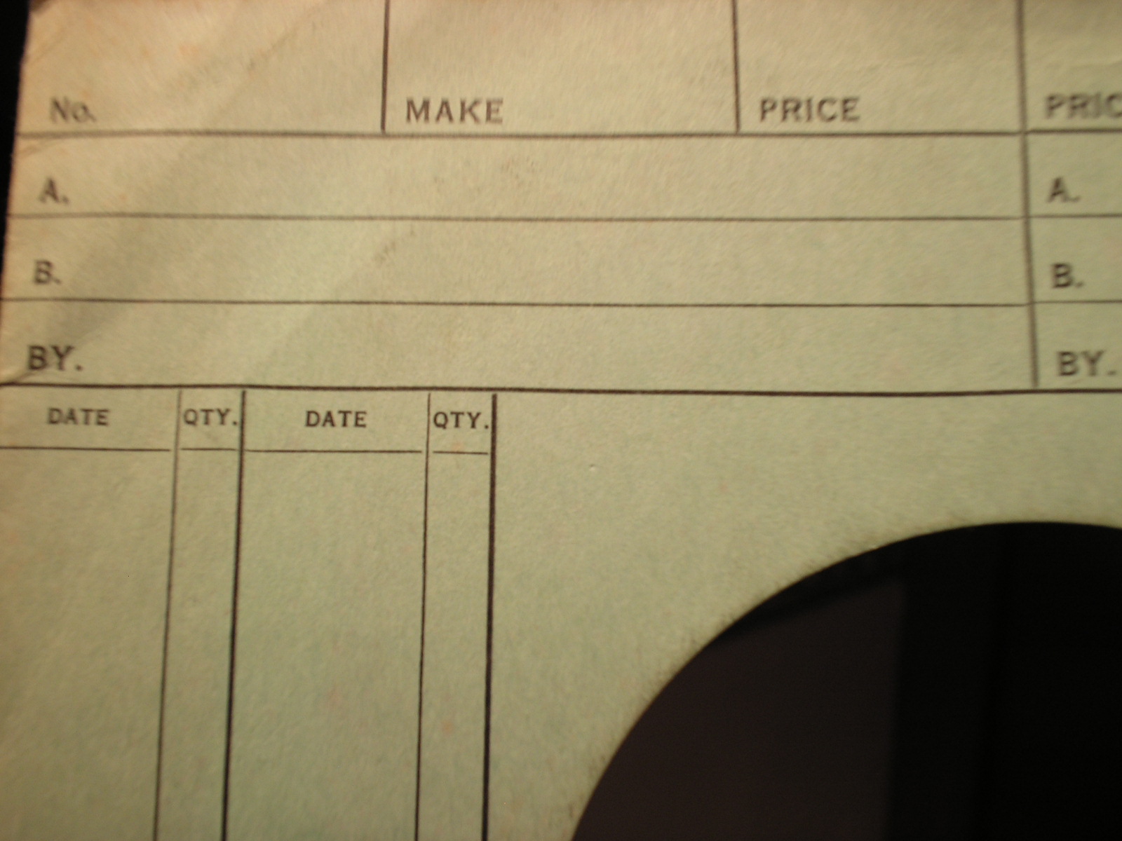 Oben links: Nr., Make, Price, darunter A:, B:, By:, darunter links- und rechtsbündig: Date:, QTY:,