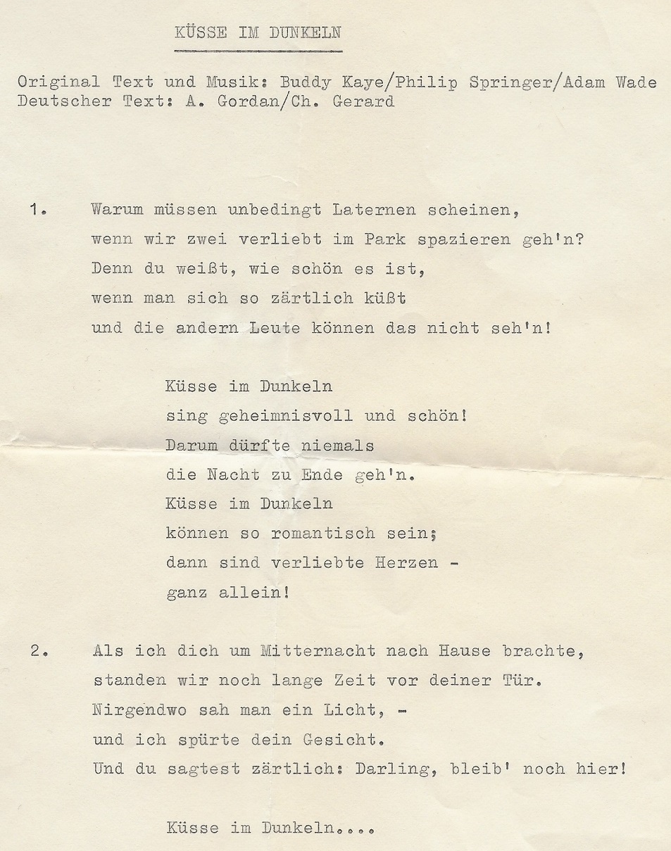 Was den deutschen Titel "Küsse im Dunkeln" mit Text von Alexander Gordan und Charles Gerard betrifft muss ich leider passen, denn da konnte ich überhaupt nichts finden.