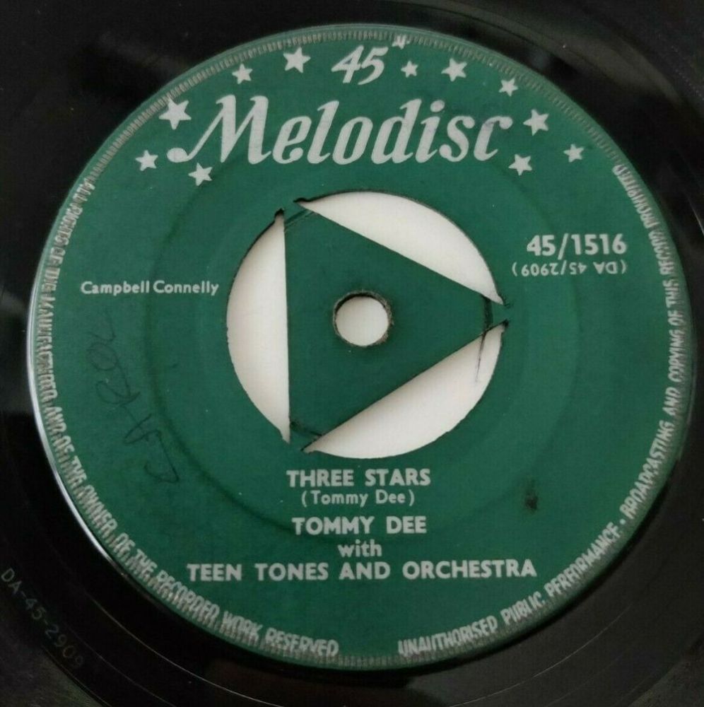 Die ersten 45er-Singles der britischen MELODISC hatten ein dreieckiges Mittelstück, das runde mit den vier „Pratzerln“ gab es erst später.