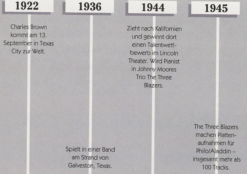 Die folgenden 45er-Singles von Charles Brown stammen etwa aus den Jahren 1952/1953. Das links angeführte Datum bezieht sich aber auf die 78er-Erstveröffentlichung: ALADDIN ?? 45....45-112A....JOHNNY MOORE'S THREE BLAZERS Charles Brown, piano; Eddie Williams, bass; Johnny Moore, guitar..Drifting Blues (112A)/Groovy (112B)