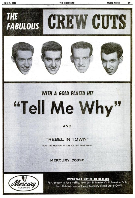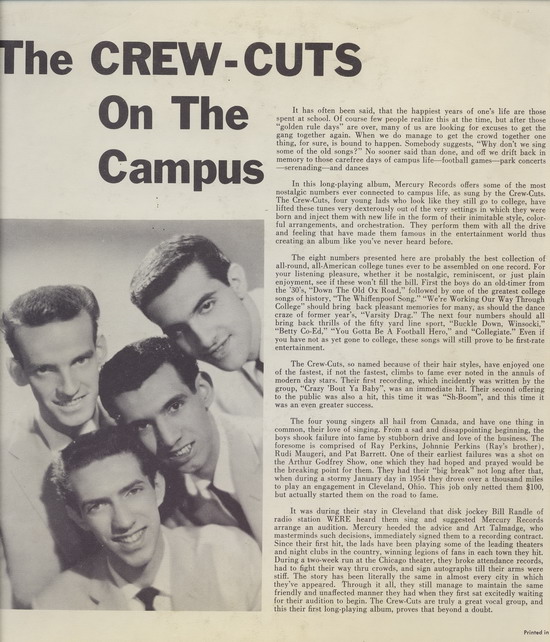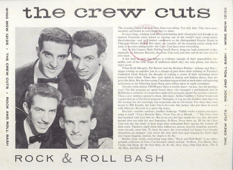The Crew Cuts kamen aus Canada. Dem Vocal-Quartett im "clean-cut harmony style" geht der Ruf voraus, ihre Erfolge durch "weiße" Cover-Versionen, teilweise zu Lasten der Originale, erzielt zu haben. Sie coverten größtenteils die erfolgreichen Aufnahmen "schwarzer" Interpreten, wie “Sh Boom (Life Could Be A Dream)“, “A Story Untold“ oder “Earth Angel“. Von 1954-1957 haben sie eine ganze Reihe sehr erfolgreicher Hits auf den Markt gebracht.