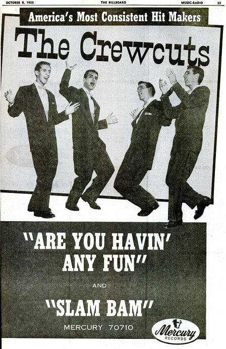 Zurück in Toronto bestritten sie im März 1953 im Casino Theatre das Vorprogramm bei einem Auftritt der Sängerin Gisele MacKenzie. Hätte sich der Gesangstar an den Namen des Quartetts erinnert, wäre es vielleicht schon zu einem Schallpattenvertrag gekommen. Pech gehabt und weiteres Tingeln war angesagt. Schließlich erhielten sie eine Einladung nach Cleveland. Dort traten sie in der Show des DJ Bill Randle auf, der sie im Anschluss an Mercury Records vermittelte. Randle hatte schon an den Karrieren von Johnnie Ray und Tony Bennett gedreht. Dort starteten sie nun unter dem Namen The Crew Cuts, abgeleitet von ihrem kurzen Haarschnitt (Crewcut = Borsten/Meckifrisur), gleich mit einem ersten Hit: “Crazy 'Bout You, Baby“, einer Eigenkomposition von Rudi Maugeri und Pat Barrett. Anschließend spezialisierten sie sich schnell auf Cover-Versionen schwarzer R&B-Hits, die sie für ihre Erfolge nutzten. Andererseits sorgten sie auf ihre Weise auch für das Steigern der Bekanntheitsgrade der teilweise landesweit weniger bekannten "schwarzen" Originalinterpreten. Sie waren sozusagen an dem Bau einer Brücke zwischen R&B und Pop beteiligt und bereiteten ungewollt den Weg für Anerkennung und Akzeptierung der "schwarzen" Originale. The Crew Cuts waren wegweisend und andere folgten ihnen auf den Spuren der Covers wie Pat Boone, Georgia Gibbs oder The McGuire Sisters. Die "weißen" Versionen hatten die der "schwarzen" Künstler meist übertroffen.