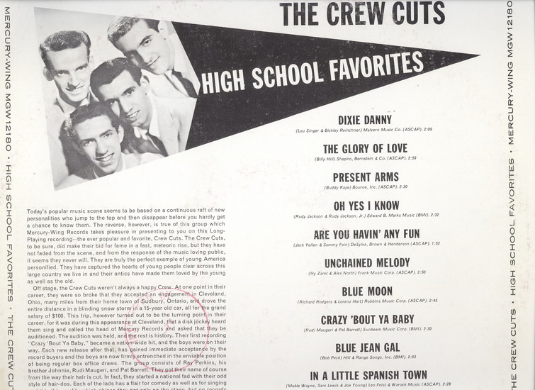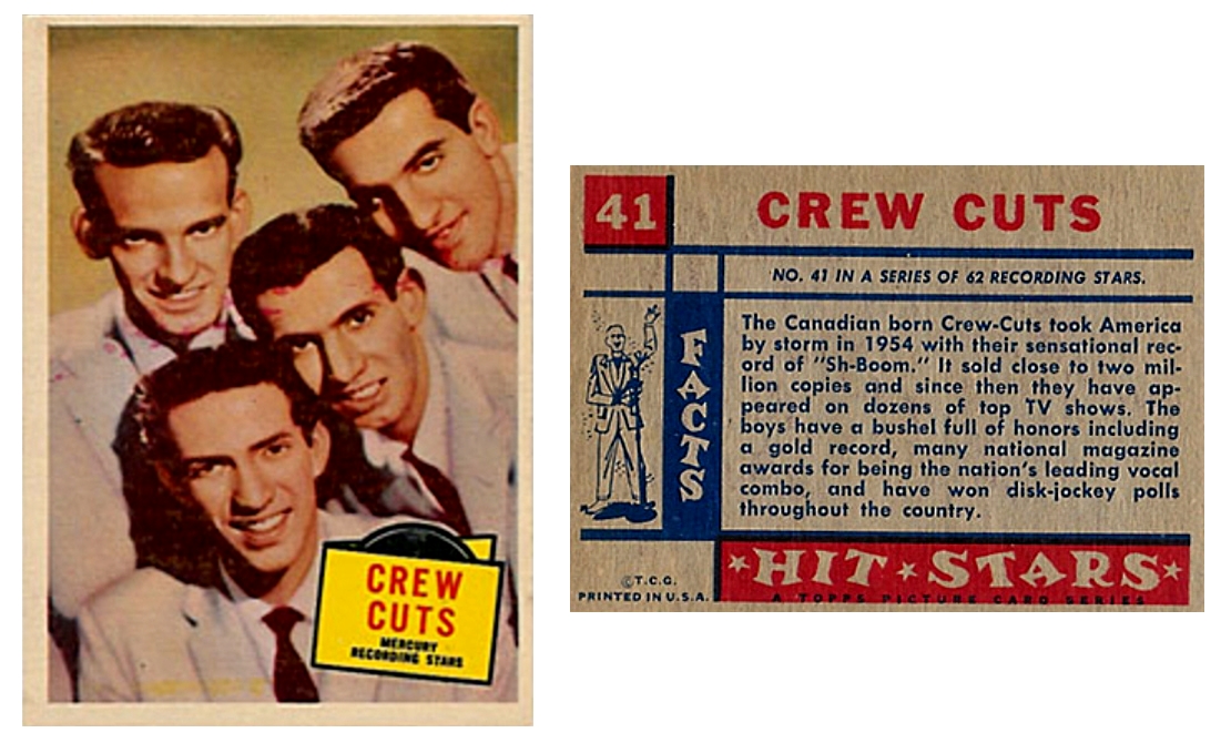 Mercury Records witterte um den Chords-Hit “Sh Boom (Life Could Be A Dream)“ das große Cover-Geschäft und produzierte der Crew Cuts-Version in nur 72 Stunden. Beim DJ Alan Freed hatte The Crew Cuts mit “Sh Boom (Life Could Be A Dream)“ nicht so gute Karten, denn er spielte das Original von The Chords. 1957 veröffentlichten The Crew Cuts ihre drei letzten Singles für Mercury Records, darunter den Titel “Suzie Q“, erstaunlicherweise eine Coverversion des weißen (!) Rhythm’n’Blues-Stars Dale Hawkins. Ihr letzter großer Cover-Hit, von "schwarz" auf "weiß gespühlt", war 1955 “Gum Drop“. Das Interesse des jungen Publikums an den "schwarzen" originalen Material war 1955/56 im Zuge der Explosion des Rock’n’Roll derart gestiegen, so dass die Masche mit den Cover-Versionen nachließ. Das bedeutete nicht, dass nicht jeder Hit seine mannigfachen Nachzieher hatte.