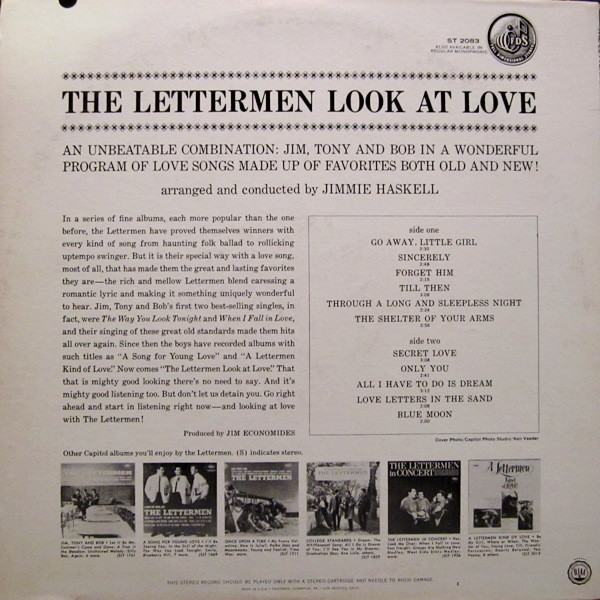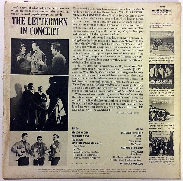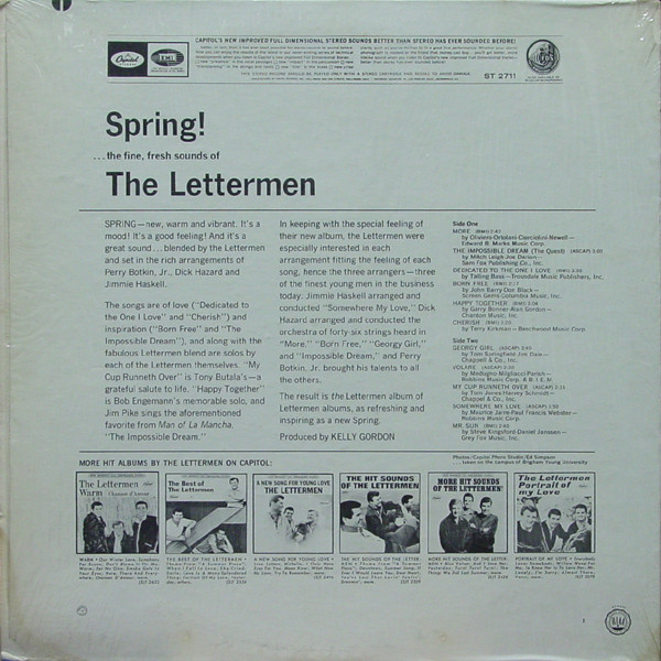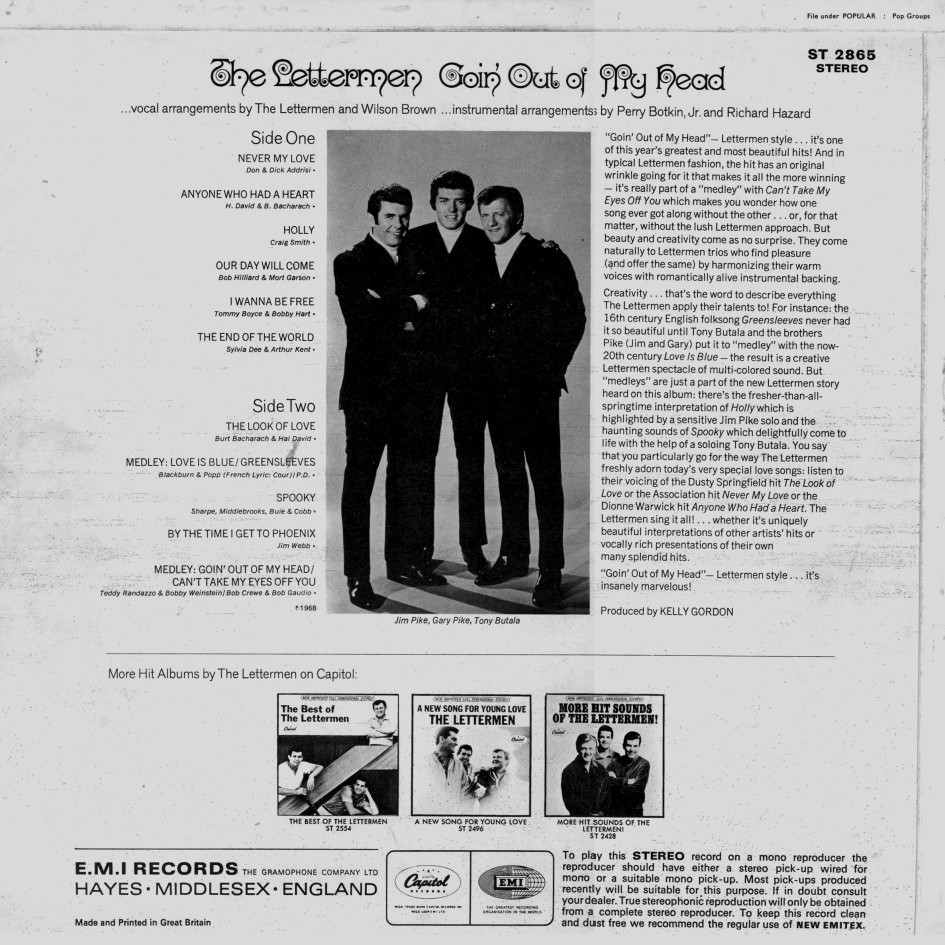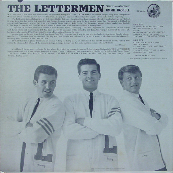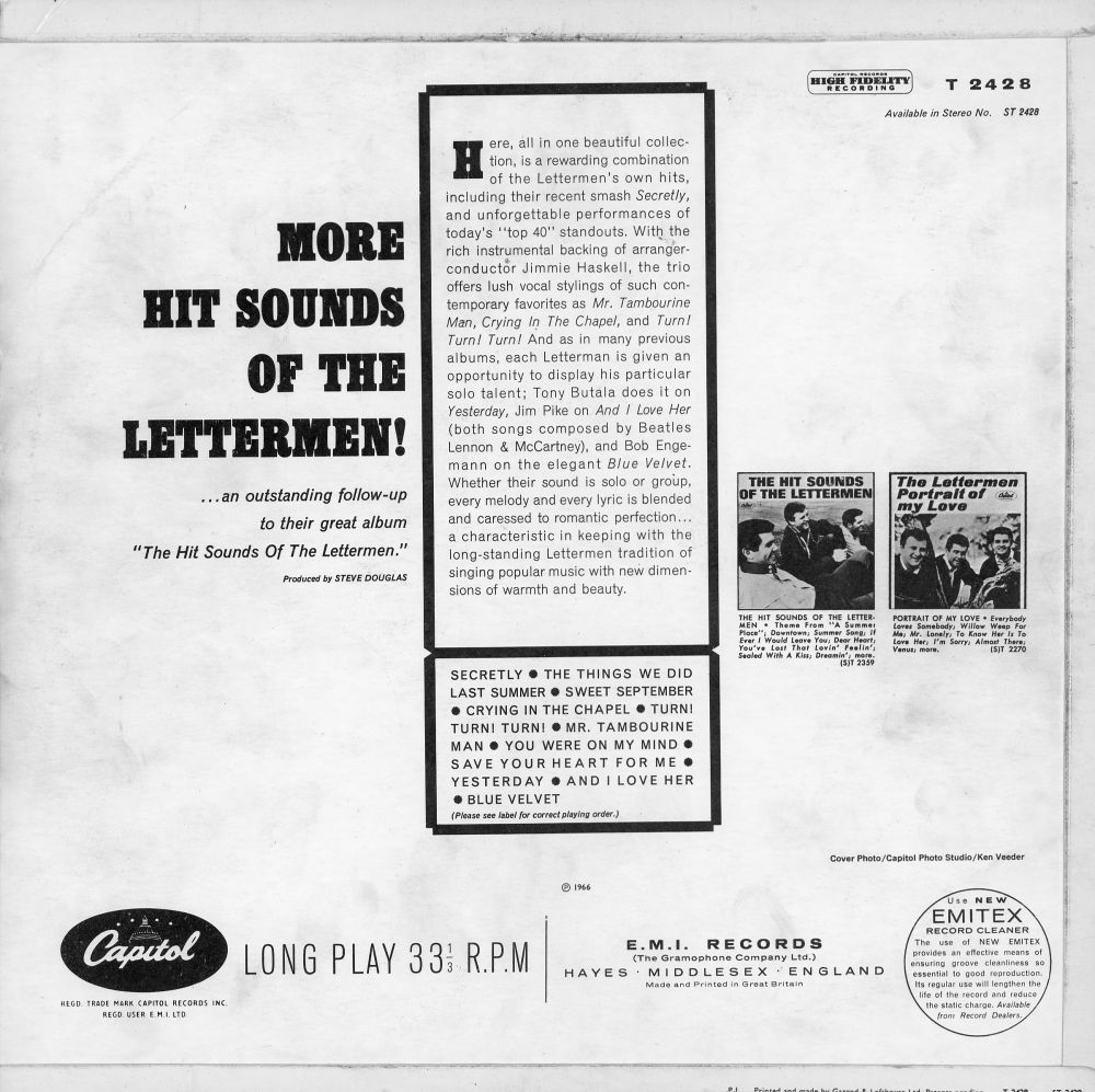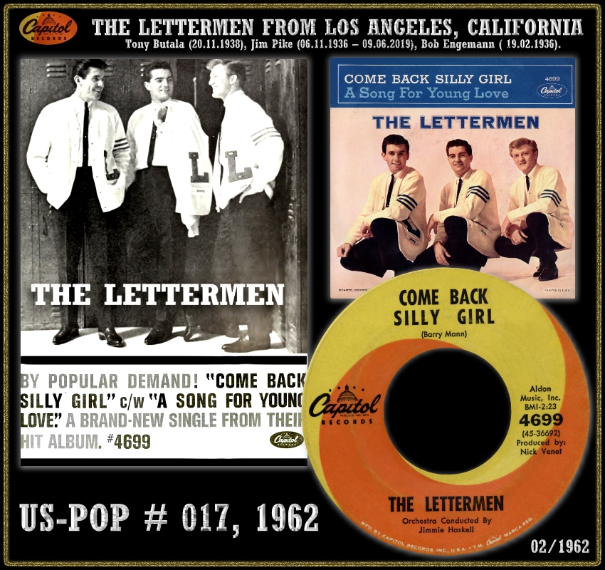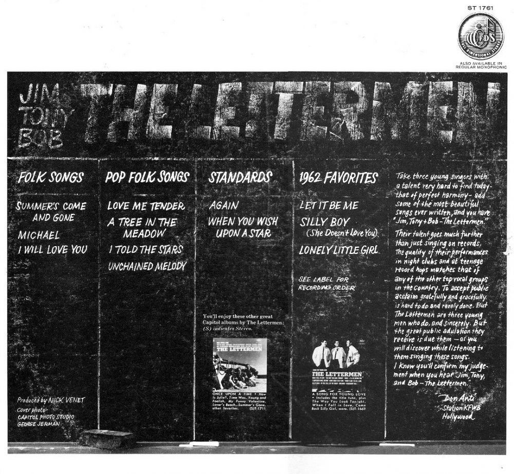 Der Leadsänger Tony Butala mit Jim Pike und Bob Engemann bildeten das Gesangs-Trio The Lettermen, dass sich in erster Linie dem leichten Schlager widmete und damit ab 1961 für lange Zeit viele Charts-Erfolge hatte. Sie lebten quasi mit ihren Schlagern neben der "neuen" Musik ganz respektierlich weiter.