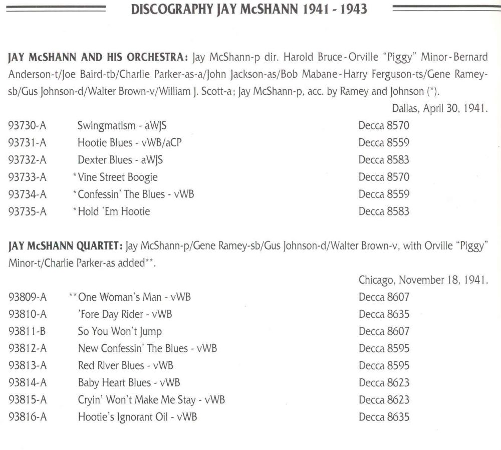 „Als die Big Band ihren Höhepunkt erreichte, hatten wir nie die Gelegenheit, das aufzunehmen, was wir wirklich wollten, weil wir ein großartiges Repertoire hatten. Wir hatten ein fantastisches Repertoire. Wir hatten nie die Gelegenheit, Aufnahmen zu machen, aber nur sehr wenig davon, weil die Plattenfirmen im Geschäft waren, um Platten zu verkaufen.“ (Jay McShann)