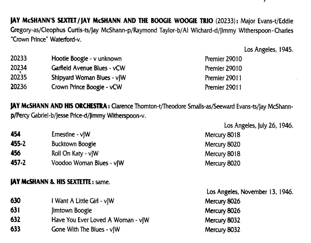 Jimmy Witherspoon begann während des Krieges in Kalkutta mit dem legendären Teddy Weatherford und wurde nach seiner Rückkehr aus Indien von McShann engagiert. Zusammen mit Kronprinz Waterford nahm er oft mit McShanns kleiner Band auf. Auf “Hootie Boogie“ ist Schlagzeuger Jesse Price zu hören, ein weiterer Veteran aus den goldenen Tagen von Kansas City. Waterford liefert eine seiner besten Leistungen auf dem rasanten “Crown Prince Boogie“.