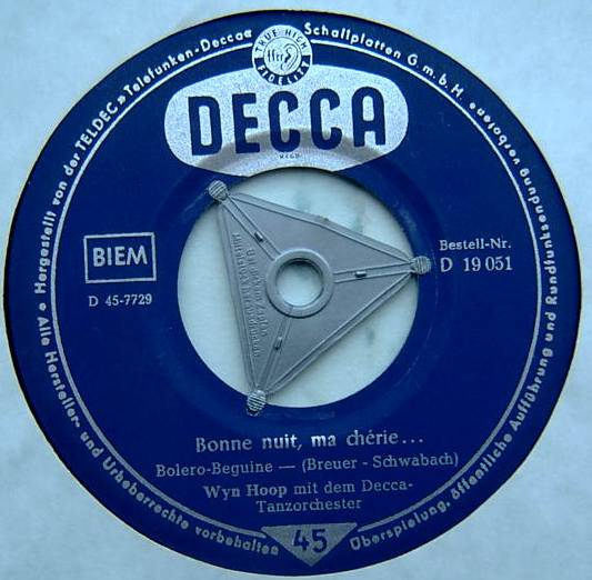 LÜSSEN, FRIED (WINFRIED LÜSSENHOOP), Sänger, Decca (u.a. 18866 "Hula-Hoop"/"He-He-He (Teenager-Polka)"-1959 & Die GOLLIES, 18889 "Die Allerschönste Zeit (Ist Die Jugendzeit)"/"Ich Möcht' Nach Hause"-1959 WILL GLAHÉ und seine Solisten, Gesang: FRIED LÜSSEN & Die GOLLIES-1959, 18963 "Schwedenpunsch" & Die GOLLIES & WILL GLAHÉ und seine Solisten), siehe auch FRED LYSSEN, später Karriere als WYN HOOP