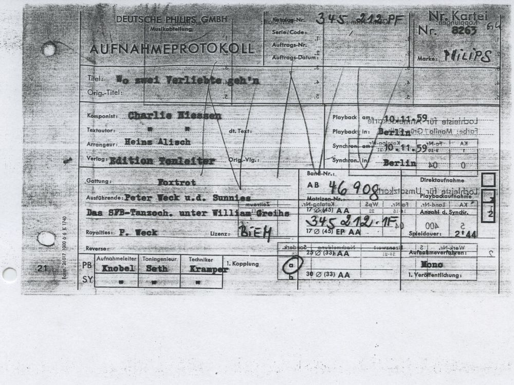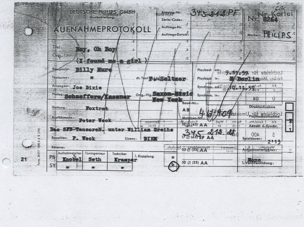 Mit deinen Unterlagen wurde aber definitiv belegt, dass es zu keiner Veröffentlichung kam. Die österreichische PHILIPS veröffentlichte aber bereits drei Singles von Peter Weck mit dem Orchester Kurt Werner und daher wollte die österreichische Filiale seine in Berlin aufgenommene Single nicht in der Versenkung verschwinden lassen und veröffentlichte sie mit einer österreichischen Nummer. Die Veröffentlichung dieser Single ist definitiv, da ich sie selbst sichten konnte. Das Veröffentlichungsdatum Februar 1960, ist aber nur eine Annahme. Als Orchester ist William Greihs auf dem Label vermerkt weshalb ich mir ziemlich sicher bin, dass es keine Neueinspielung gab. Weiters habe ich Daten gefunden die besagen, das die deutsche PHILIPS im April 1960 doch noch auf den Markt kam. Wie weit diese Daten der Realität entsprechen, kann ich zur Zeit nicht beurteilen.
