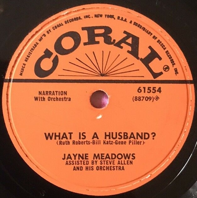 12 55....9-61554....STEVE ALLEN Narration With Chorus & Orchestra Directed By STEVE ALLEN..What Is A Wife ? (45-88865)/JAYNE MEADOWS Assisted By STEVE ALLEN & HIS ORCH. Narration With Orchestra..What Is A Husband? (45-88709) (61542/--------)