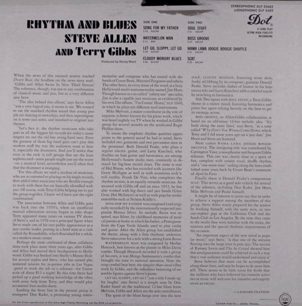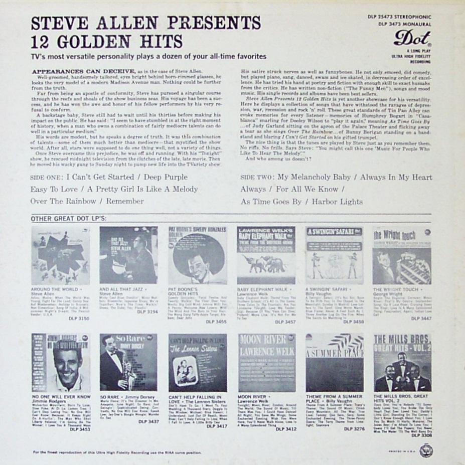 Der Pianist, Orchesterleiter, Sänger, Komponist, Schauspieler, Komödiant, sowie Rndfunk- und Fernsehstar Steve Allen wurde am 26. Dezember 1921 in New York City als Stephen Valentine Patrick William Allen geboren und wuchs in der „South-Side“ von Chicago auf. Er verstarb am 30. Oktober 2000 in Los Angeles, Kalifornien. Seine Rundfunk-Karriere begann bei KOY in Phoenix, Arizona. Seine ersten musikalischen Veröffentlichungen hatte er 1951 als Pianist bei COLUMBIA.