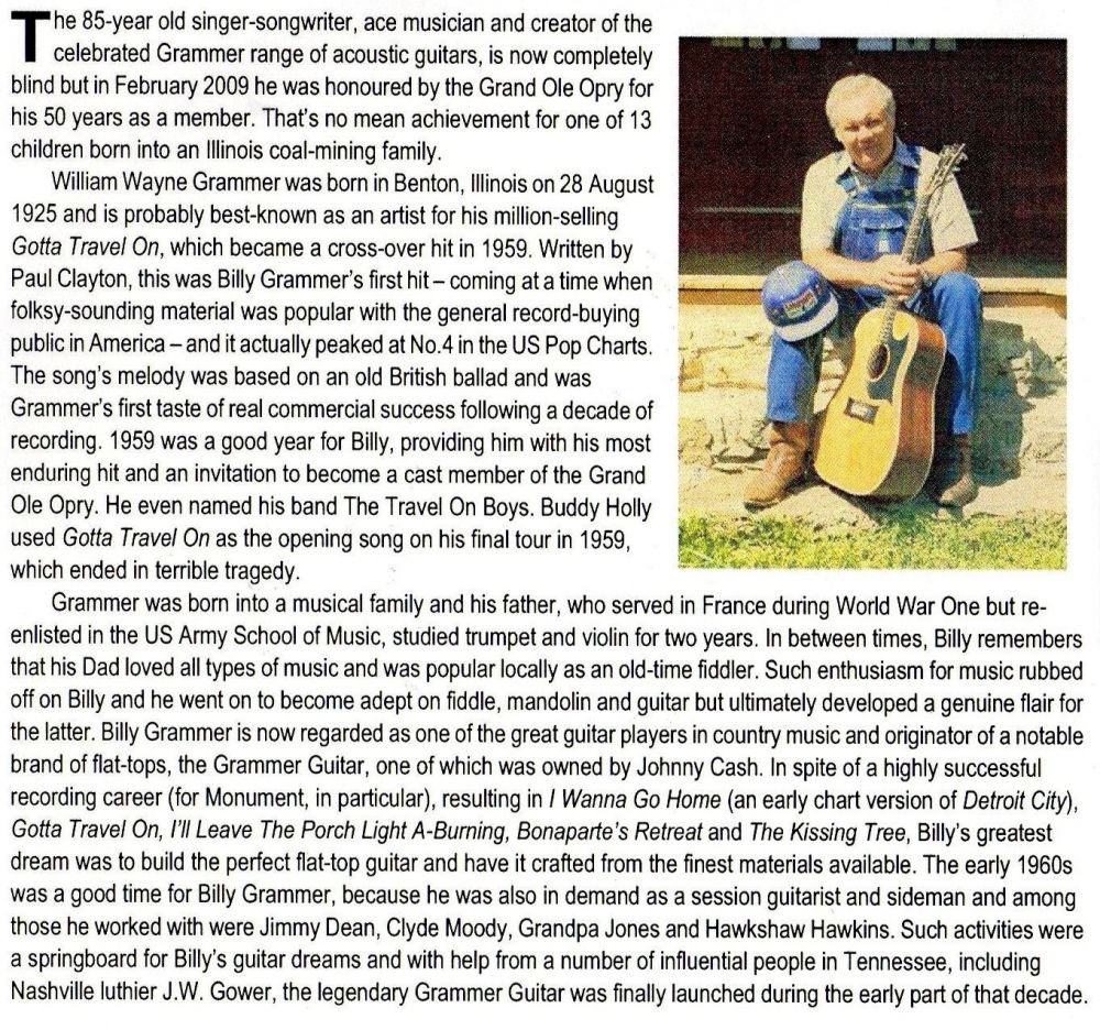 Der 85 jährige Singer-Songwriter, Spitzenmusiker und Schöpfer der gefeierten Grammer-Akustikgitarren-Reihe ist jetzt völlig blind, wurde aber im Februar 2009 von der Grand Ole Opry für seine 50-jährige Mitgliedschaft geehrt. Das ist keine geringe Leistung für eines von 13 Kindern, die in einer Bergbaufamilie in Illinois geboren wurden. William Wayne Grammer wurde am 28. August 1925 in Benton/Illinois geboren und ist als Künstler wohl am bekanntesten für seinen millionenfach verkauften “Gotta Travel On“, der 1959 zum "cross-over"-Hit wurde. Geschrieben von Paul Clayton, war dies Billy Grammers erster Hit – kam zu einer Zeit, als volkstümlich klingendes Material bei der allgemeinen Plattenkäufer-Öffentlichkeit in Amerika beliebt war – und erreichte tatsächlich # 4 in den US-Pop-Charts. Die Melodie des Songs basierte auf einer alten britischen Ballade und war Grammers erster Vorgeschmack auf einen echten kommerziellen Erfolg nach einem Jahrzehnt der Aufnahme. 1959 war ein gutes Jahr für Billy und bescherte ihm seinen nachhaltigsten Hit und eine Einladung, ein Besetzungsmitglied der Grand Ole Opry zu werden. Er nannte sogar seine Band The Travel On Boys. Buddy Holly verwendete “Gotta Travel On“ als Eröffnungssong auf seiner letzten Tournee im Jahr 1959, die in einer schrecklichen Tragödie endete.