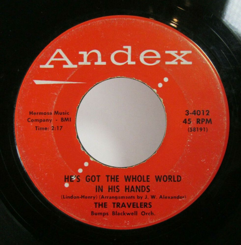 05 58….3-4012….THE TRAVELERS BUMPS BLACKWELL ORCH. ..He's Got The Whole World In His Hands (58191)/Green Town Girl (58192)