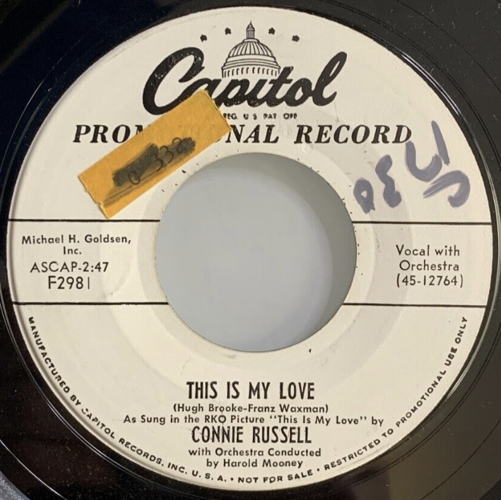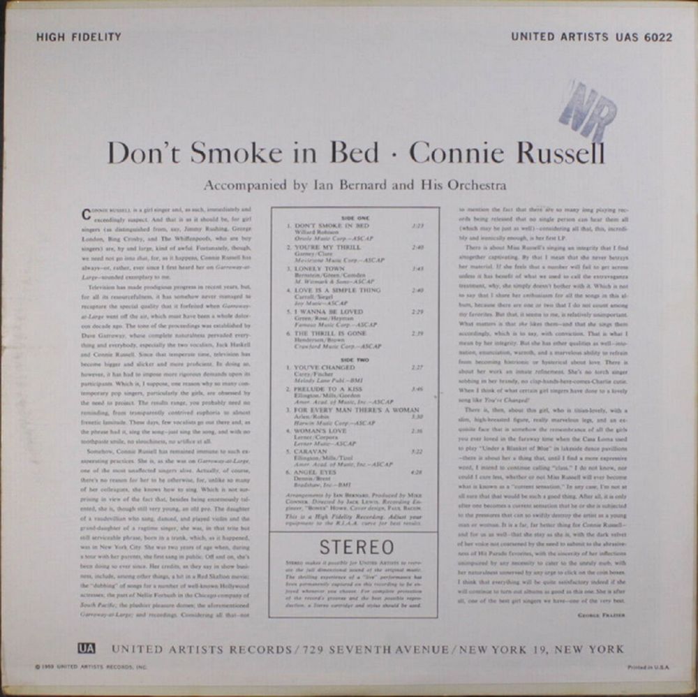 Connie Russell(vo), Ian Bernard(arr,cond), Al Porcino, Ray Linn, Manny Klein(tp), Murray McEachern, Milt Bernhart, Joe Howard, Herbie Harper(tb), George Roberts(btb), Vince De Rosa(Frh), Harry Klee(fl,bcl,ts), Chuck Gentry(cl), Jules Jacob(oboe,ts), Abe Most(fl,cl,ts), Howard Roberts(g), Jimmy Rowles(p), Joe Mondragon(b), Alvin Stoller, Milt Holland, Mel Lewis(ds), Larry Bunker(vb,bgo), String section(12 violins, 3 violas, 2 cellos)
