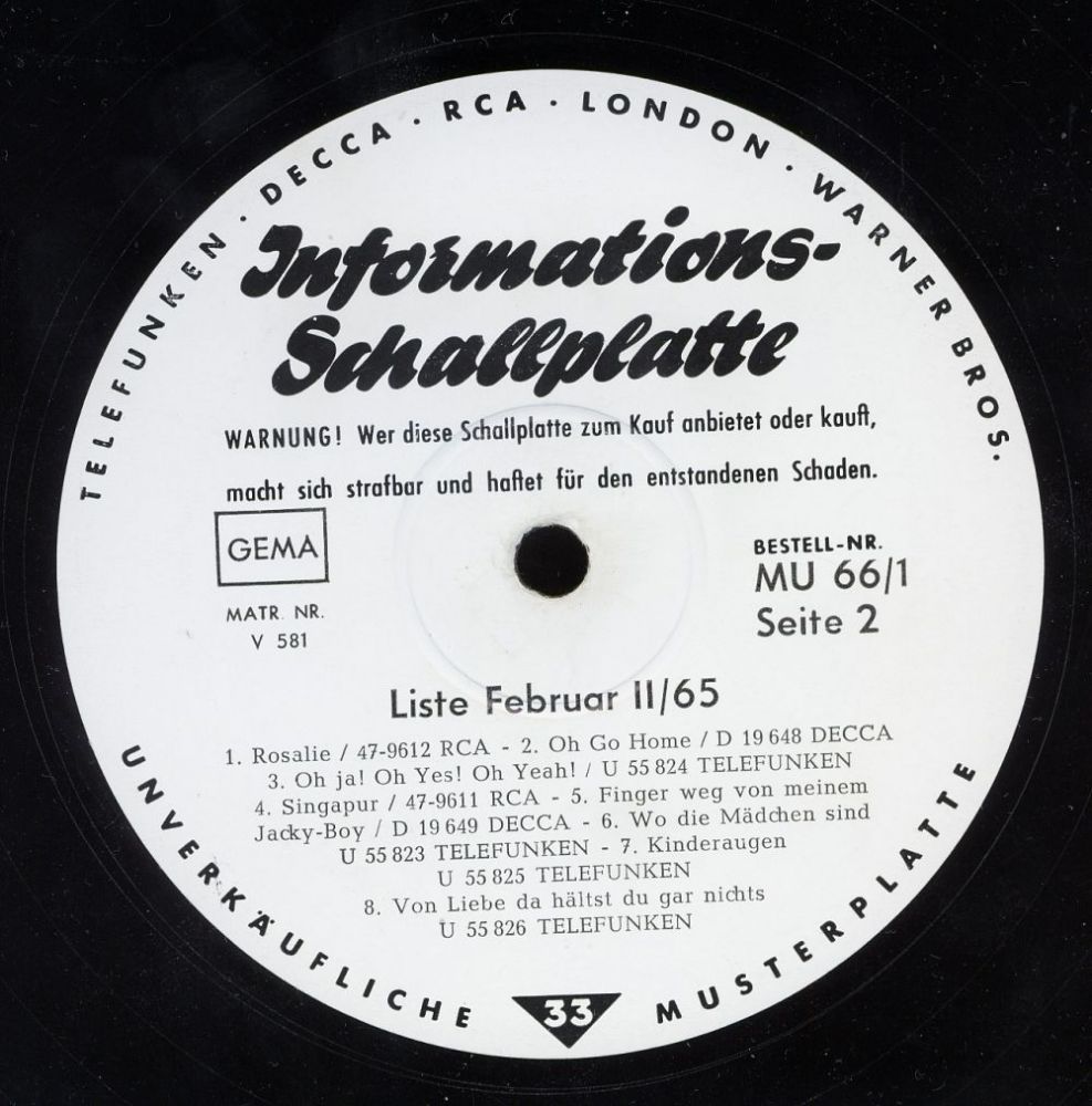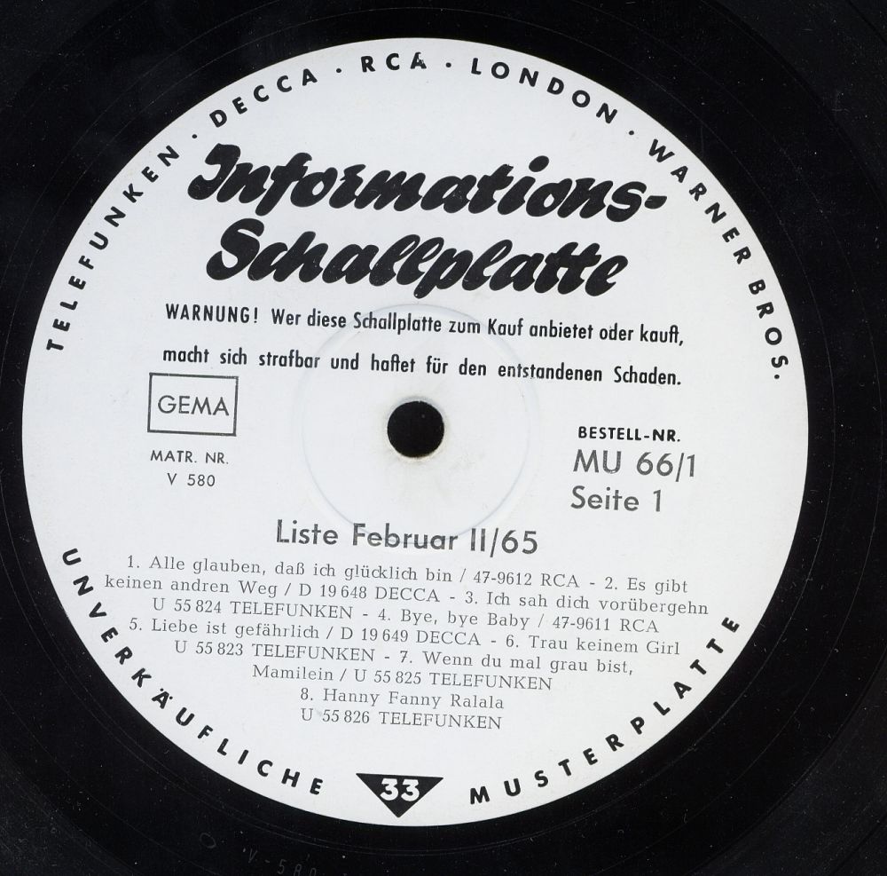 diese zwei Titel waren übrigens auch im Februar 1965 auf Info-LP Anhänge an diesem Beitrag Dateiname: Info Disc 1965-02 V 580-581 E.jpg Dateigröße: 139.98 KB Titel: Heruntergeladen: 225 Dateiname: Info Disc 1965-02 V 580-581 F.jpg Dateigröße: 127.28 KB Titel: Heruntergeladen: 174 Dateiname: Info Disc 1965-02 V 580-581 Ex.jpg Dateigröße: 105.12 KB Titel: Heruntergeladen: 215