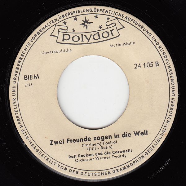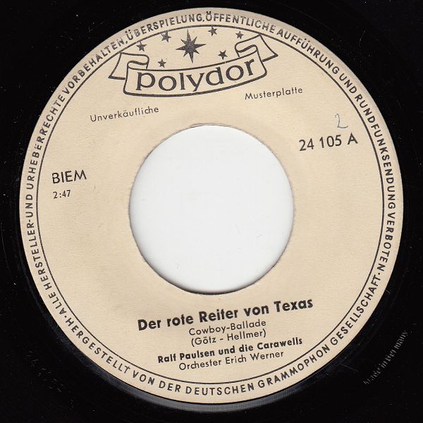 12 59....24 105 A....Ralf Paulsen und die Carawells Orchester Erich Werner..Der rote Reiter von Texas/ B....Ralf Paulsen und die Carawells Orchester Werner Twardy..Zwei Freunde zogen in die Welt (Partners) (STEREO: 220017)