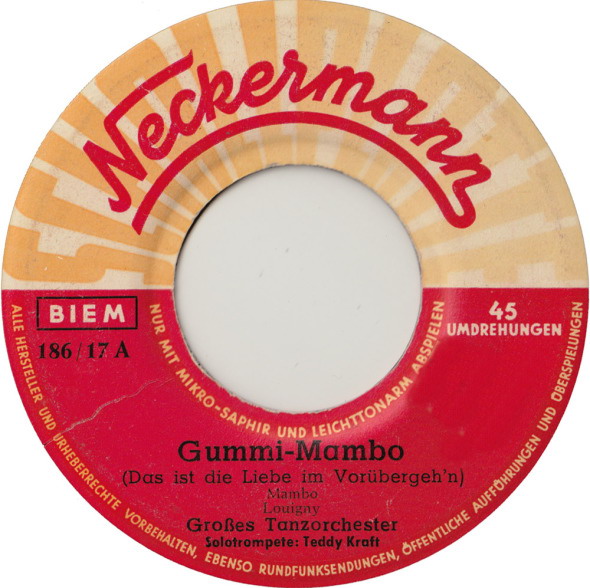 Am 11. Mai 2014 teilte ich bereits mit, dass ich endlich eine gesungene deutschsprachige Version des "Gummi-Mambos" bei einem Plattenfreund gefunden habe. Spät aber doch bin ich auf die Idee gekommen, dass man diese Schellack vielleicht scannen könnte und es ist tatsächlich mit viel Mühe gelungen und hier kommt das Ergebnis, für das ich mich bei meinem Plattenfreund herzlichst bedanke.