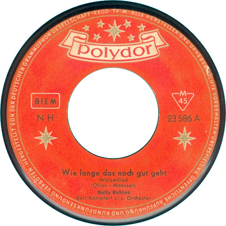 | Information: | 0 023 564 - SI - Bert Kaempfert & Frank Forster - Heute bin ich ein Millionär - Du darfst doch nicht von mir geh´n - Polydor - GER - Label B |