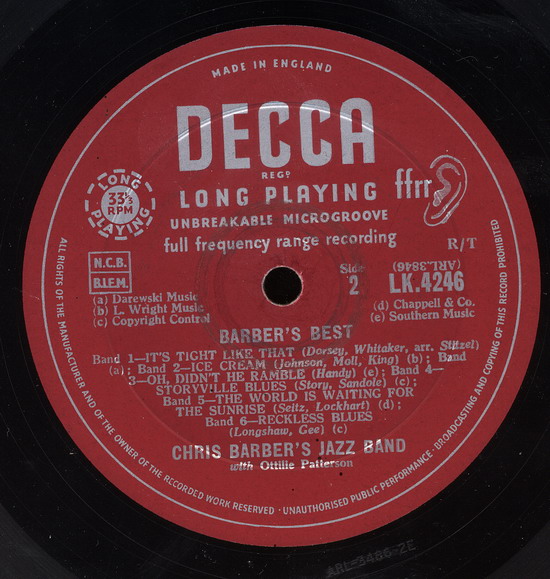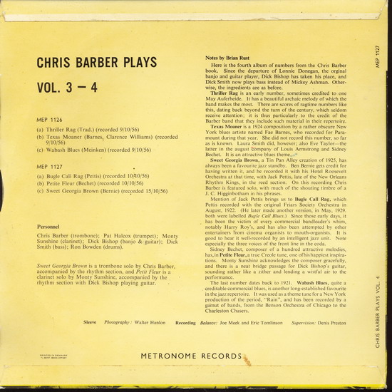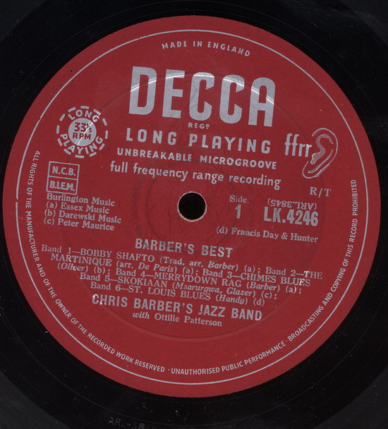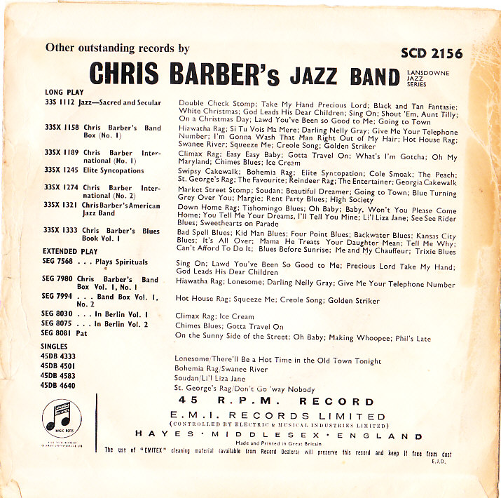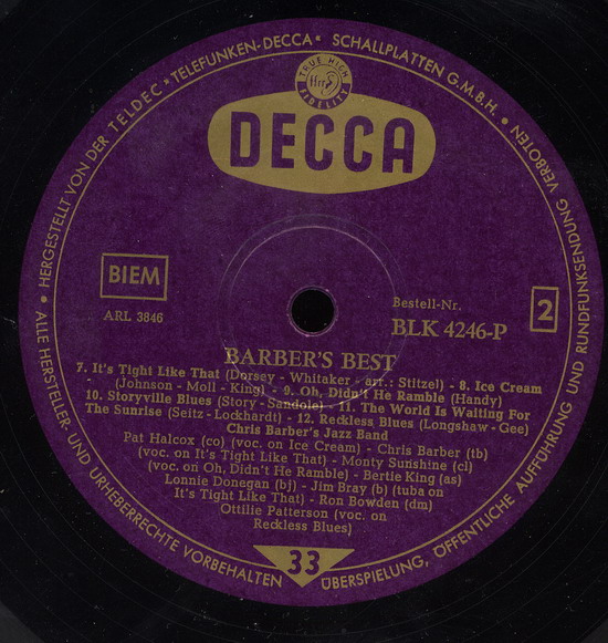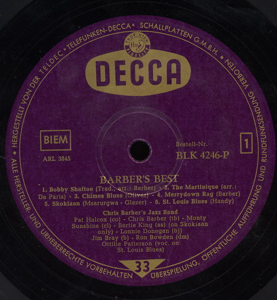 nun bis Februar 1957 als Chris Barber Skiffle Group (Dick Bishop-guitar, vocal, Johnny Duncan-guitar, mandolin, vocal, Chris Barber-bass, Ron Bowden-drums), 4 Titel für Pye-Nixa (Nixa NJE 1025, Nixa NJ 2014, Nixa NJ 2017), die selben Titel erschienen weiterhin auf Metronome und Marble,
