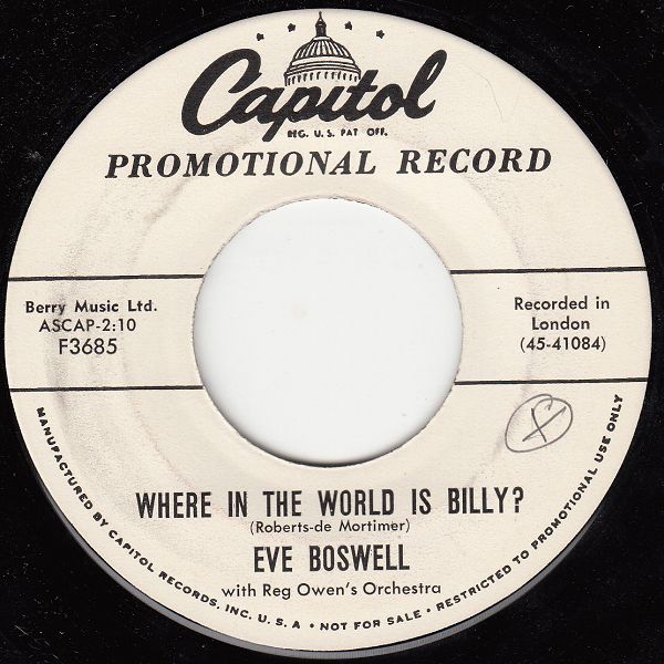 ?? 56....45-R 4230....EVE BOSWELL with Orchestra conducted by Reg Owen Solo piano, Eve Boswell..True Love/EVE BOSWELL with Orchestra conducted by Reg Owen..Where In The World Is Billy?