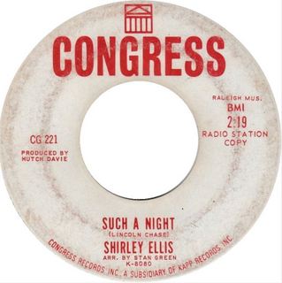 Ihre dritte Congress-45, “Takin‘ Care Of Business“ (Record World Pop # 150), wurde von der Balladen-Butterseite “Shy One“ in den Schatten gestellt, die # 43 der Cash Box R&B-Charts, # 6 der WAMS, Wilmington/Delaware und # 20 der WARM, Wilkes-Barre/Pennsylvania, erreichte. Shirleys Phrasierung verlieh jeder Zeile von Chases “Such a Night“, ihrer nächsten Single, lateinamerikanische Nuancen und emotionale Wirkung. Stan Greens elektrisierende Streichergruppe schickte das Arrangement mitten ins Herz von Spanish Harlem. Ihre Interpretation hätte sie zurück in die obersten Ränge der Charts katapultieren sollen – aber Elvis Presley veröffentlichte plötzlich eine Version, die auf Anhieb auf # 16 kletterte.