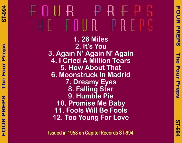 01 57....F3621....THE FOUR PREPS with Orchestra under the direction of Gus Levene..Moonstruck In Madrid (45-16273)/I Cried A Million Tears (45-16271)