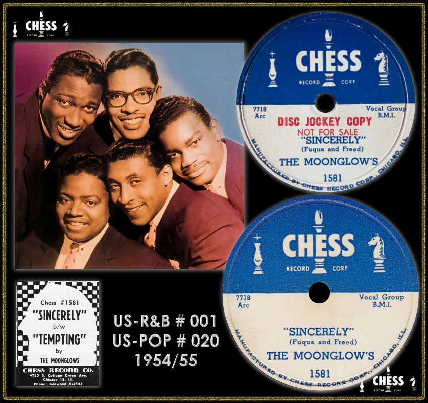 Nach Veröffentlichungen erster Schallplatten für Champagne - (1952) und Chance Records (1953/54) kam auf Vermittlung von Alan Freed in New York eine Vertragsunterzeichnung mit Chess Records zustande. Mit ihrer ersten Veröffentlichung auf Chess 1581, ”Sincerely”, geschrieben von Fuqua und Freed, platzierten sie sich auf # 1 in den R&B- und # 20 der Pop-Charts und konnten damit den Moonglows’ Sound im Doo Wop-Geschehen etablieren. Mit der weißen Cover-Version von ”Sincerly” überflügelten The McGuire Sisters auf Coral 61323 mit ihrem # 1 in den Pop-Charts das Original mit Längen. Doch der Chess-Konzern reagierte und brachte zeitgleich bei seinem Sub-Label Checker den Titel ”Shoo Doo-Be Doo” nochmals als Bobby Lester & The Moonlighters auf den Markt. Die Gruppe hatte sich also selbst gecovert, jedoch hier nicht mit dem Lead-Vocal von Bobby Lester, sondern Harvey Fuqua.