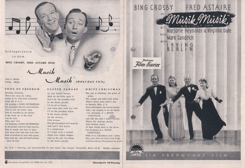 1942 in "Holiday Inn" (Musik Musik) und dann halt 1948 in Easter Parade (Osterspaziergang) Anhänge an diesem Beitrag Dateiname: IMG_20240401_0018.jpg Dateigröße: 157.38 KB Titel: Heruntergeladen: 127 Dateiname: IMG_20240401_001--8.jpg Dateigröße: 189.2 KB Titel: Heruntergeladen: 120 Dateiname: IMG_20240401_0017.jpg Dateigröße: 191.58 KB Titel: Heruntergeladen: 129