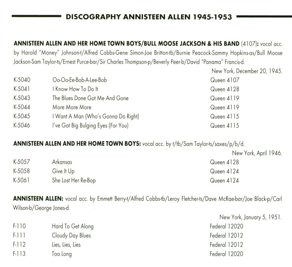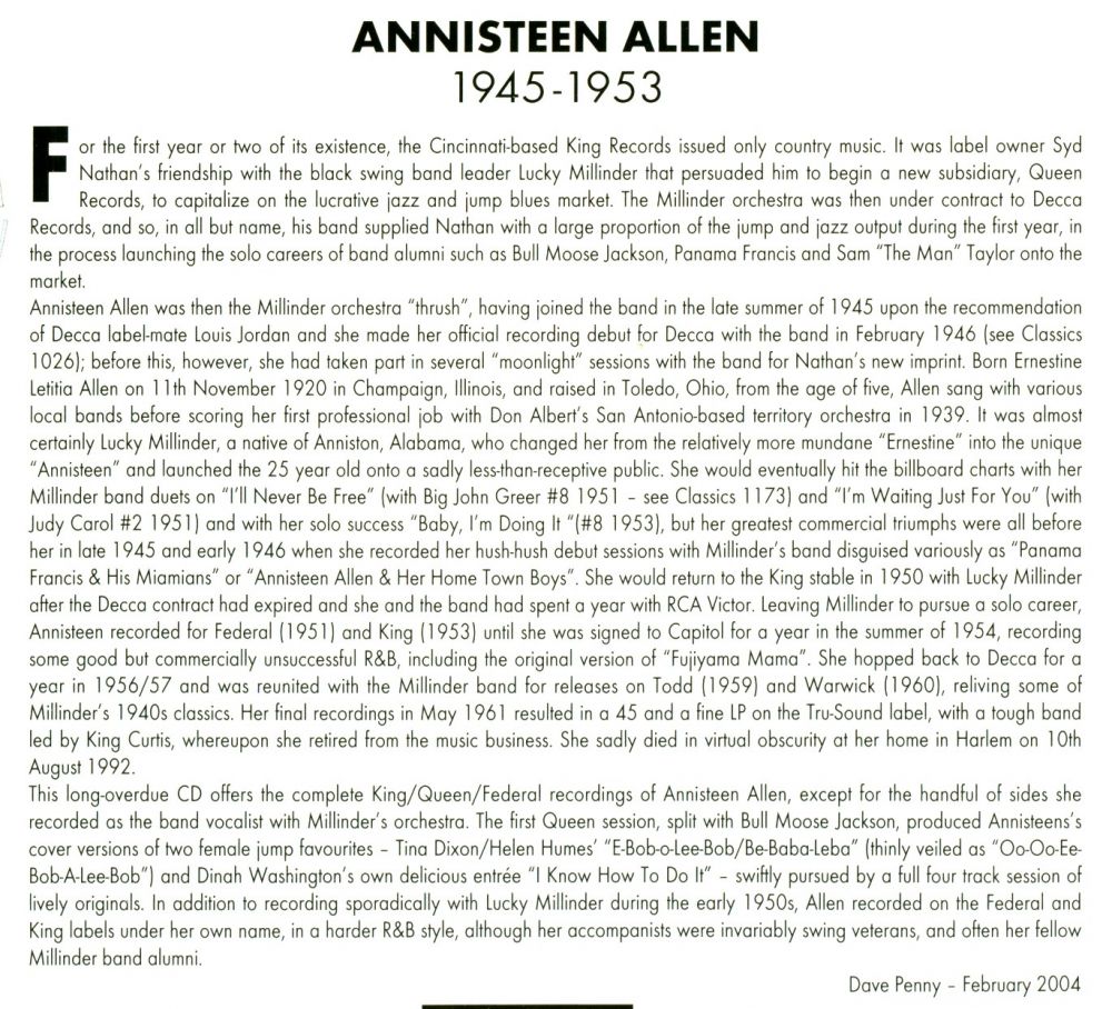 Aufnahmen 1945 und 1946 Siehe #24 für Queen Records Anhänge an diesem Beitrag Dateiname: Allen1aa.jpg Dateigröße: 101.13 KB Titel: Heruntergeladen: 143 Dateiname: Allen1b.jpg Dateigröße: 107.76 KB Titel: Heruntergeladen: 137