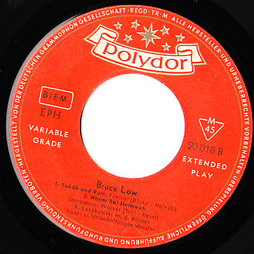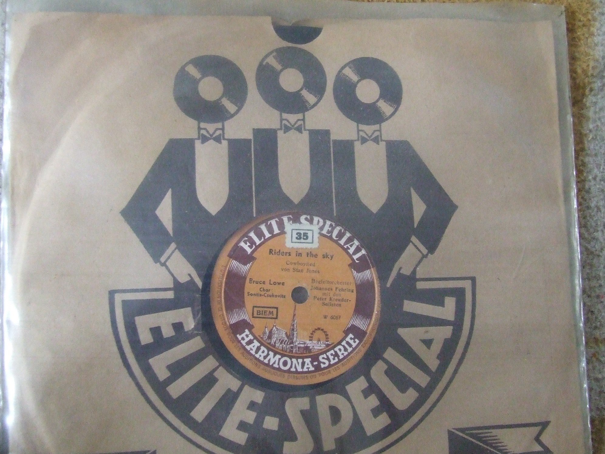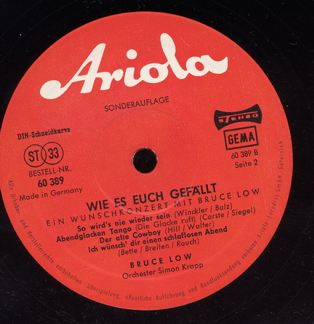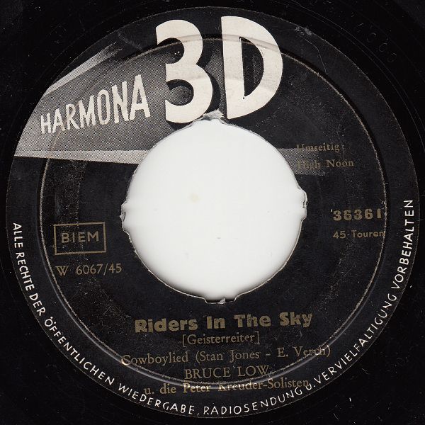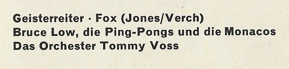 Dazu die Originalausgabe dieser "Geisterreiter" die in obiger Aufstellung fehlt, da sie keine deutschsprachige Cover-Version ist. Bruce Low singt nämlich englisch. Bei BERTELSMANN hat man Original- und deutschen Titel gewechselt und dafür unten in Klammer "engl." geschrieben. Bei diesem bizarren Vorgang hat man auch die Begleitorchester verwechselt, aber Kreuder und Fehring haben sich wenigstens gut gekannt. Die Autoren wurden vom Original löblicherweise nicht abgeschrieben, sie wurden überhaupt weggelassen, und das war klug, denn da steht auch Ernst Verch, der den deutschen Text geschrieben hat darauf, obwohl englisch gesungen wird.
