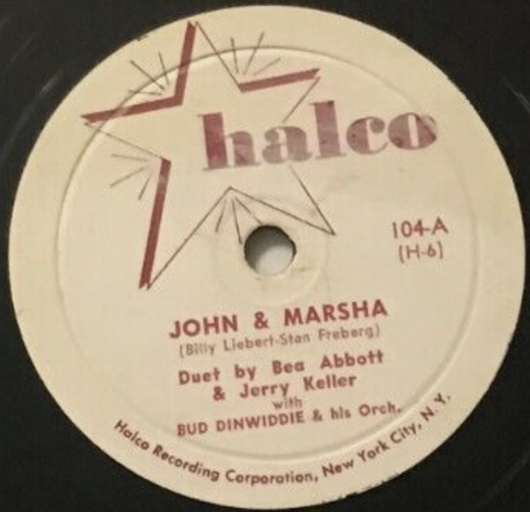 ?? 51....104-A....Duet by Bea Abbott & Jerry Keller with BUD DINWIDDIE & his Orch. ….John & Marsha (H-6)/-B….Vocal by JERRY KELLER with BUD DINWIDDIE & his Orch. ..The Roving Kind (H-5)